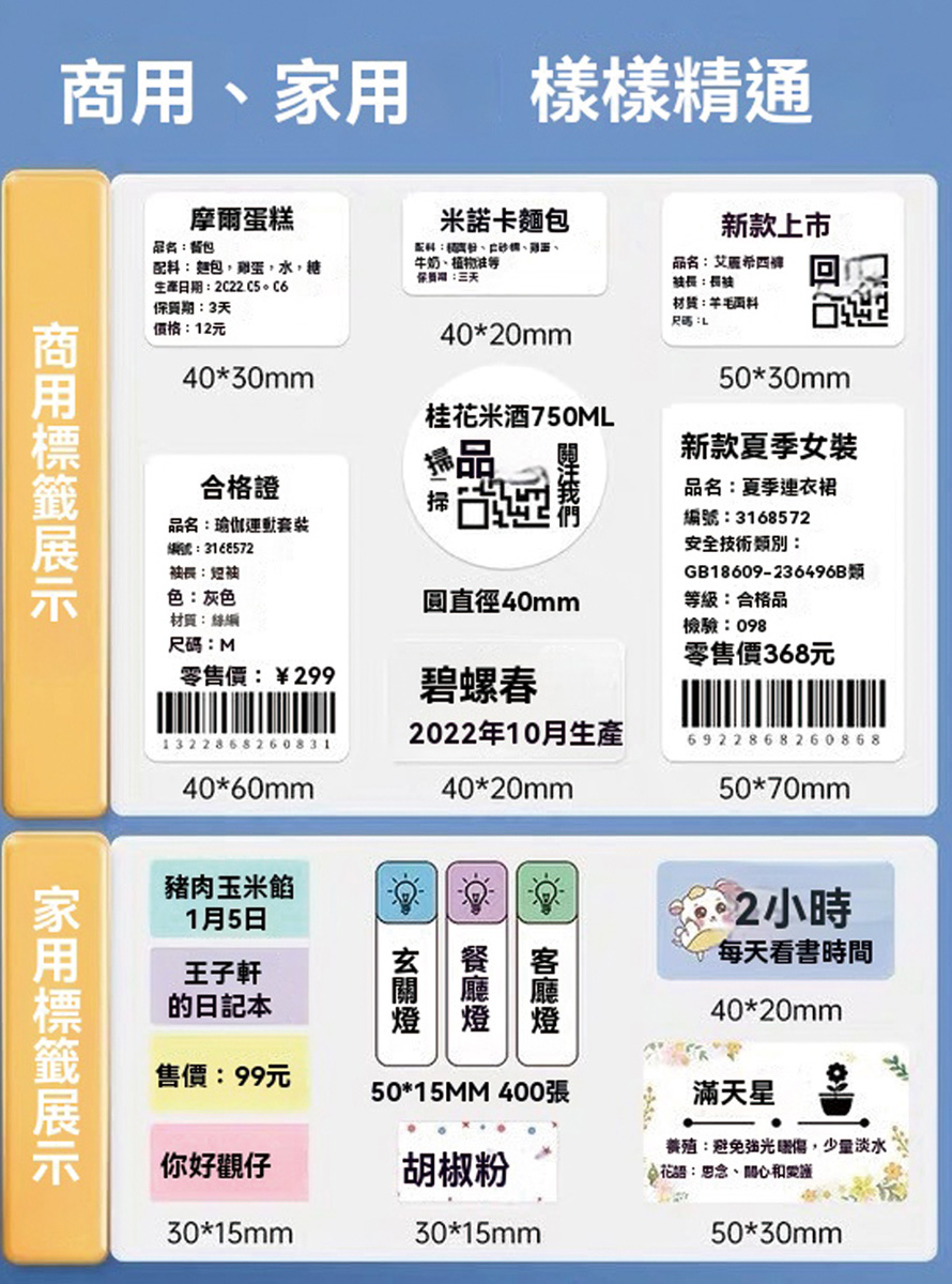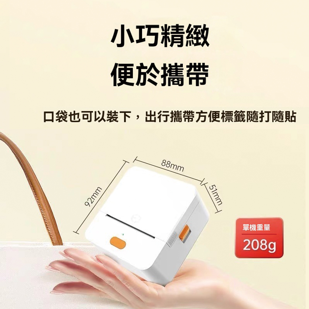 列印方式: 熱感應尺寸: 88*92*51mm重量:208g標籤寬度: 20mm到最大寬度58mm電池容量: 1500 mAh*3.7 V列印密度: 203 dpi顯示方式: RGB指示燈使用溫度: 0C ~45C充電方式: TypeC5V充電使用時間:配Type-C充電線充滿電可連續列印2個小時左右NCC : CCAH23LP7490T5BSMI : R46620德佟原廠貼紙特點:防撕、防水、防油、防刮無雙酚A檢測通過商檢檢驗檢驗合格證書號碼:20203404126-00-6備註 : 不要使用快充頭充電,以免造成損壞