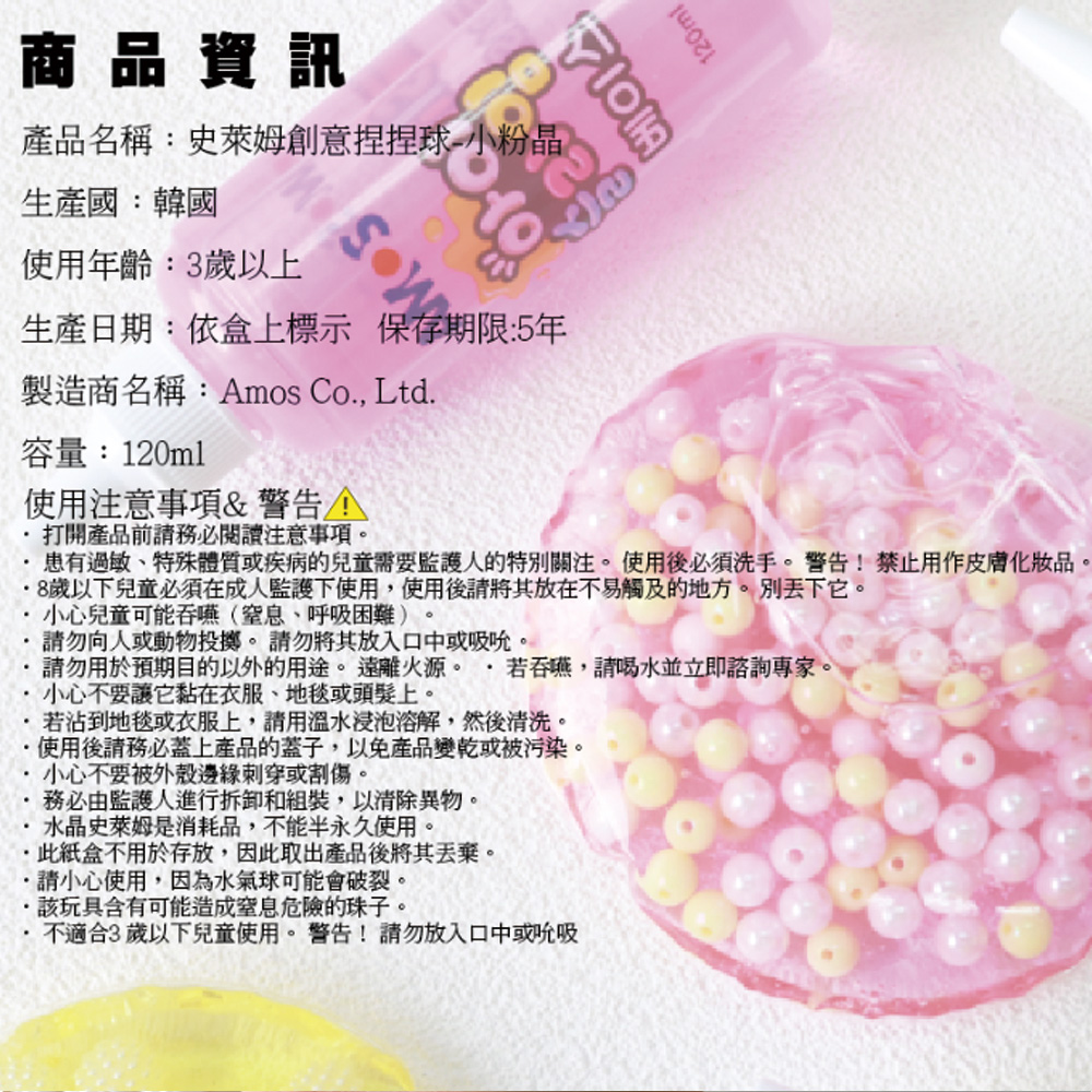 產品名稱:史萊姆創意捏捏球-小粉晶☆容物:1個捏捏球體+1個透明注入管+120ML透明史萊姆膠+水晶體生產國:韓國使用年齡:3歲以上生產日期:依盒上標示 保存期限:5年製造商名稱:AmosCo.,Ltd.容量:120mlBSMI商品檢驗標識字號: 標檢局印製 UC2 8147601~8149088使用注意事項&警告打開產品前請務必閱讀注意事項。·患有過敏、特殊體質或疾病的兒意需要監農人的特別關注。使用後必須洗手。·8歲以下兒童必須在成人監護下使用,使用後請將其放在不易觸及的地方。·小心兒童可能吞嚥(窒息、呼吸困難)。·請勿向人或動物投擲。請勿將其放入口中或吸吮。·請勿用於預期目的以外的用途。遠離火源··若吞嚥,請喝水並立即專家。·小心不要讓它黏在衣服、地毯或頭髮上。·若沾到地毯或衣服上,請用溫水浸泡溶解,然後清洗。·使用後請業務必蓋上產品的蓋子,以免產品變乾或被污染。·小心不要被外殼邊邊緣刺穿或割傷。·務必由監護人進行拆卸和組裝,以清除異物。·水晶史萊姆是消耗品,不能半永久使用。·此只盒不用於不存放,因此取出產品后將其丟棄。·請小心使用,因為水氣球可能會破裂。·該玩具含有可能造成窒息危險的珠子。·不適合3歲以下兒童童使用。