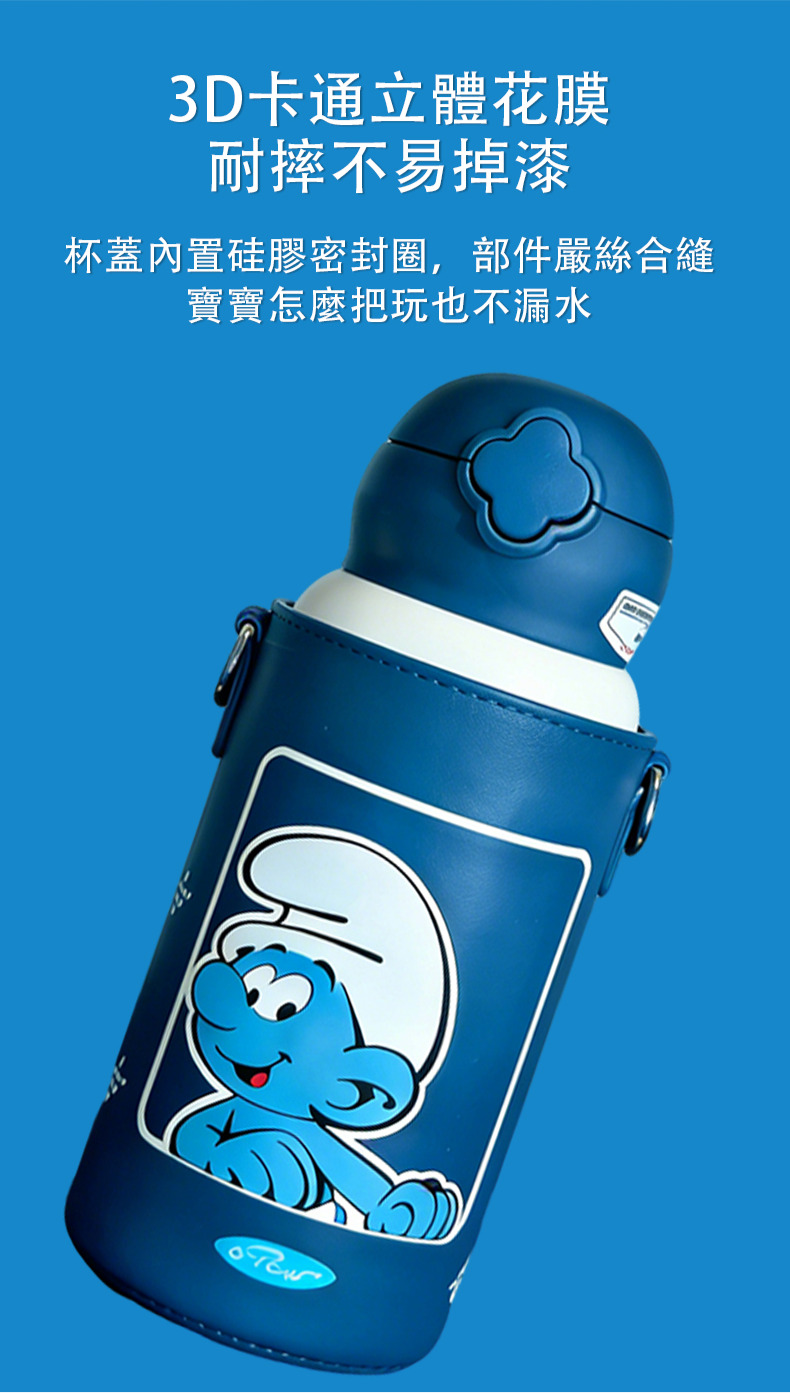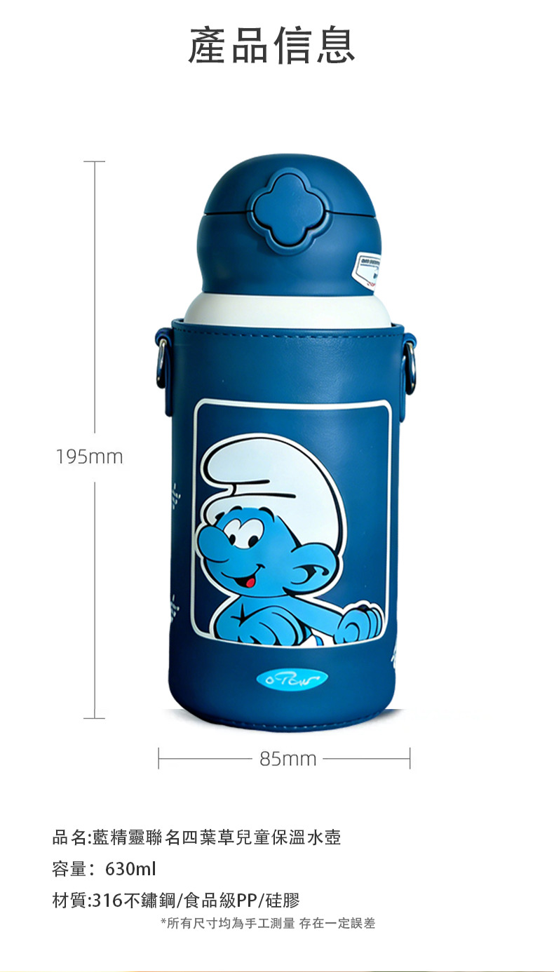 ❄秋冬必備!藍精靈聯名兒童保溫水壺,讓寶貝隨時喝上溫暖好水❄長效保溫|316醫療級鋼|一鍵啟飲|防漏耐摔你是不是也煩惱——寶貝上學水放涼?外出喝水漏得到處都是?材質不安全不放心?別再妥協了!這款「藍精靈聯名四葉草兒童保溫水壺」就是媽媽們的安心之選!✅ 雙層真空,長效鎖溫鎖涼👉 升級真空工藝:630ml大容量,保溫長達12小時、保冷24小時,秋冬喝熱奶,夏天喝冰飲,四季都適用。👉 多層鎖溫結構:外殼防燙,內膽保溫,寶貝捧在手心不燙手,戶外玩耍也能喝到溫度剛好的水。✅ 一鍵啟飲,暢飲不費力👉 四葉草按壓設計:萌趣造型,寶貝小手輕按即開,搭配柔軟硅膠吸管,吸吮省力,不傷寶貝牙齦。👉 防嗆防漏細節:吸管帶防嗆閥,倒置搖晃也不漏水,書包、露營包隨便放,不怕弄濕書本和衣物。✅ 316醫療級鋼,安全守護成長👉 食品級內膽材質:採用316醫療級不鏽鋼,耐腐蝕、不易生銹,裝奶、裝湯、裝果汁都安心,無異味不串味。👉 可拆卸易清洗:杯蓋、吸管、密封圈全可拆卸,無清潔死角,避免細菌滋生,媽媽清洗更省心。✅ 正版聯名,耐摔又好看👉 藍精靈萌趣設計:正版授權圖案,3D立體花膜工藝,色彩鮮豔不易掉漆,寶貝愛不釋手,主動喝水不磨蹭。👉 堅固耐摔材質:外殼選用加厚耐摔材質,搭配專屬防護杯套,戶外跑跳、校園磕碰都不怕,耐用度拉滿。 ✅ 便攜百搭,多場景適用👉 加寬肩帶杯套:可調節肩帶,輕便不壓肩,寶貝背著上學、遊玩超輕鬆,也能手提攜帶。👉 一壺多用:搭配替換杯蓋,吸管杯、直飲杯隨意切換,滿足寶貝不同年齡、不同場景的飲水需求。✅ 品名:藍精靈聯名四葉草兒童保溫水壺✅ 容量:630ml✅ 材質:內膽316不鏽鋼、外殼食品級PP、杯套耐磨皮革✅ 顏色:經典藍白(藍精靈聯名款)產地:PRC(韓國監製)