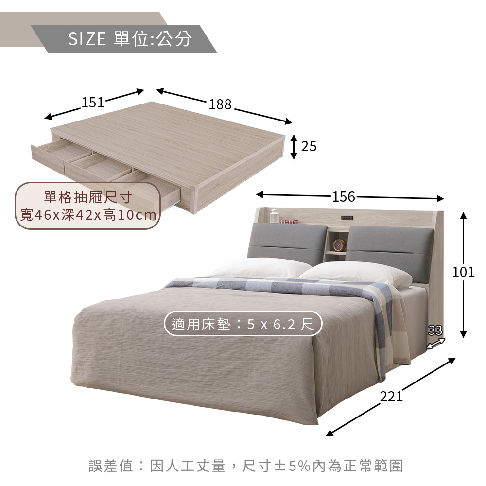 ◆同款二款色調,搭配居家風格◆工業積層木色調風格◆可掀式床頭箱輕鬆收納◆安心配送,由專人到府組裝◆實用便利插座孔設計◆床頭箱+抽屜床組合整組配件:床頭箱 x 1 + 抽屜床 x 1尺寸:寬 156 x 深 221 x 高 101 公分適用床墊:5 x 6.2 尺材質:高級木心板顏色:積層木色 產地:台灣誤差值:因人工丈量,尺寸±5%內為正常範圍