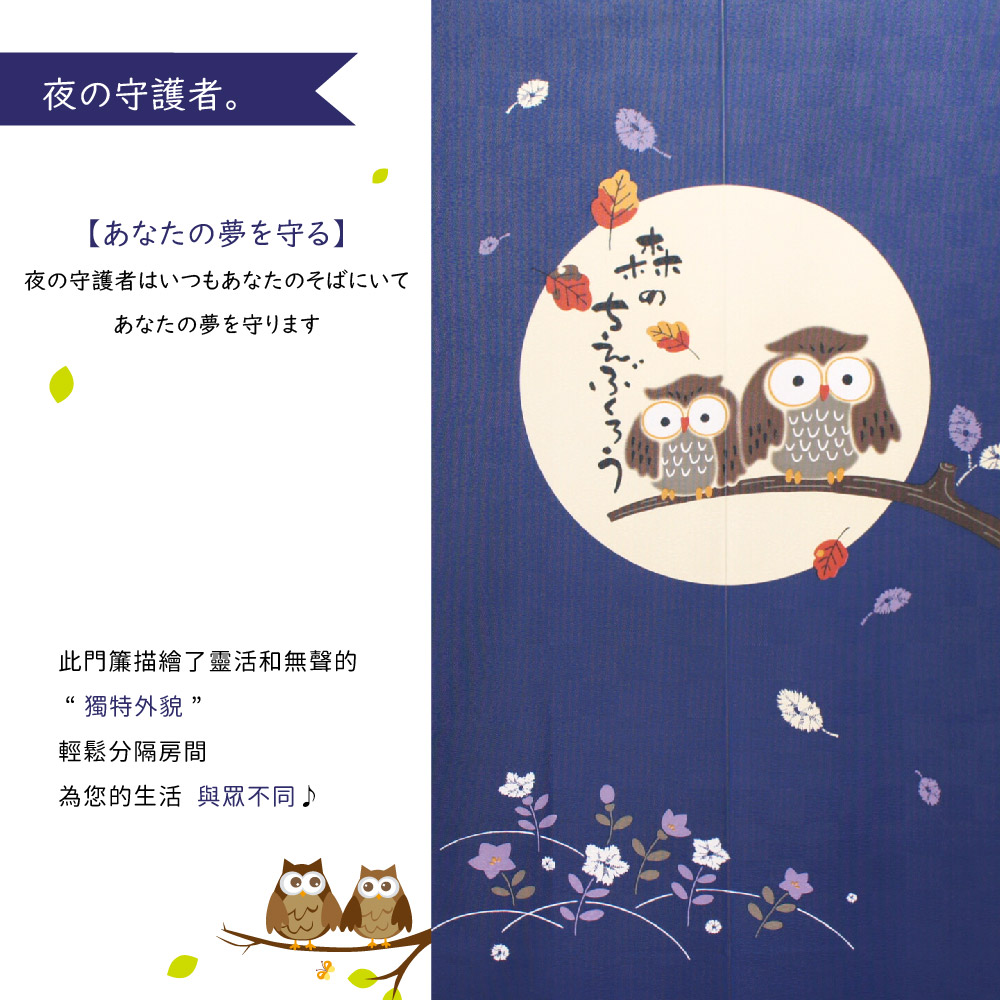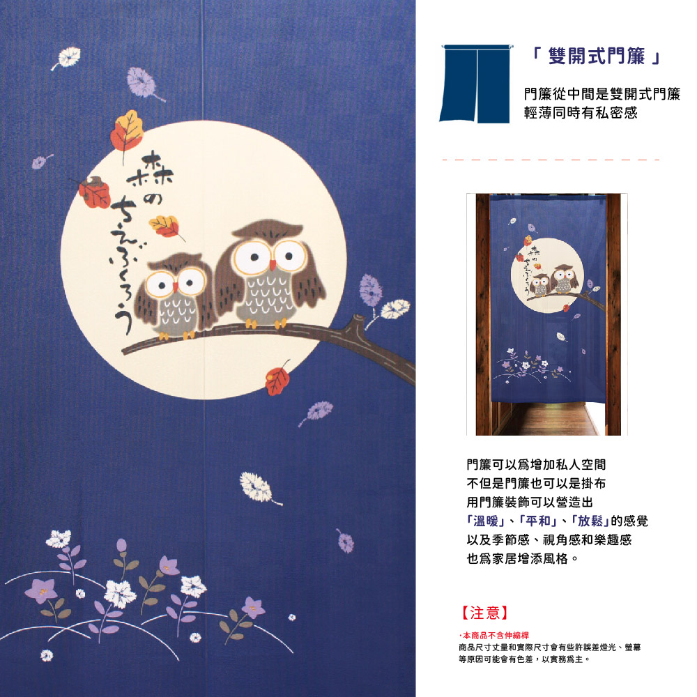 日本製【コスモ】長門簾《貓頭鷹》海軍藍フクロウは【不苦労】など語呂合わせから福を招くと言われており縁起の良いのれんです。使用場所に合わせて使える3サイズです。縁起物/開運/福招き/梟/紺/青/NV/ネイビー/藍據說貓頭鷹可以帶來好運,因為它們有”有忘掉苦勞去厄開運”等雙關語這是一個吉祥的善意,好運護身符。生產國: 日本材質/成分:100%聚酯纖維包裝:獨立袋包裝顏色:海軍藍尺寸:約85公分(寬)x 150 公分(長)國際條碼:4943741000938出貨:門簾*1件清洗方式:可水洗、不可漂白、不可烘乾顏色:如圖,網頁產品因拍攝與各顯示器顯色不同關係,與實品略有差異, 此商品圖為參考用之情境圖示,產品內容以規格敘述內容為準適用:臥室門、廚房門、浴室門、衣櫥、玄關入口...等【注意事項】伸縮桿需自備,商品內容為門簾本體並無附桿子