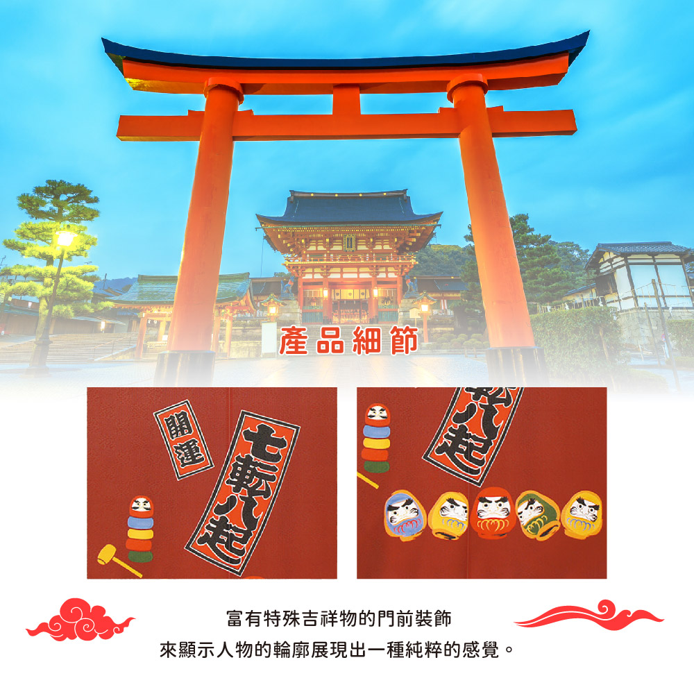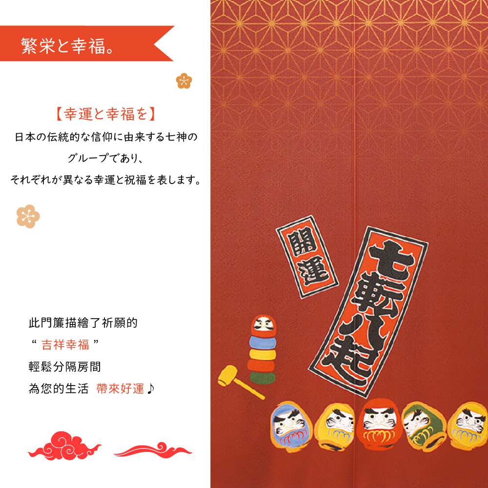 日本製【コスモ】長門簾《達摩七福神》幸運紅福の神として進行されている七福神や、「福来郎」「不苦労」などの語呂合わせから幸せを運ぶと言われているフクロウなど日本で古くから親しまれている縁起物をあしらったのれんシリーズです。場所を取らずに、縁起をかついだりお部屋の雰囲気を変えたりすることが出来ますので、インテリアに、お土産に、贈り物などにぜひご活用下さい。七福神被推崇為吉祥之神據說能帶來幸福。由於日文的貓頭鷹(フクロウ)可以稱作「不苦労」「福来郎」,對日本人來說,貓頭鷹從以前就是一種象徵幸運的動物。這是在日本長期流行的帶有幸運符的門簾系列。它們可以用來帶來好運或改變房間的氣氛而不佔用太多空間,它們可以作為室內裝飾、及送人紀念品、禮品等生產國: 日本材質/成分:100%聚酯纖維%包裝:獨立袋包裝顏色:紅色尺寸:約85 公分(寬)x 150 公分(長)國際條碼:4943741934387出貨:門簾*1件清洗方式:可水洗、不可漂白、不可烘乾顏色:如圖,網頁產品因拍攝與各顯示器顯色不同關係,與實品略有差異, 此商品圖為參考用之情境圖示,產品內容以規格敘述內容為準適用:臥室門、廚房門、浴室門、衣櫥、玄關入口...等【注意事項】伸縮桿需自備,商品內容為門簾本體並無附桿子