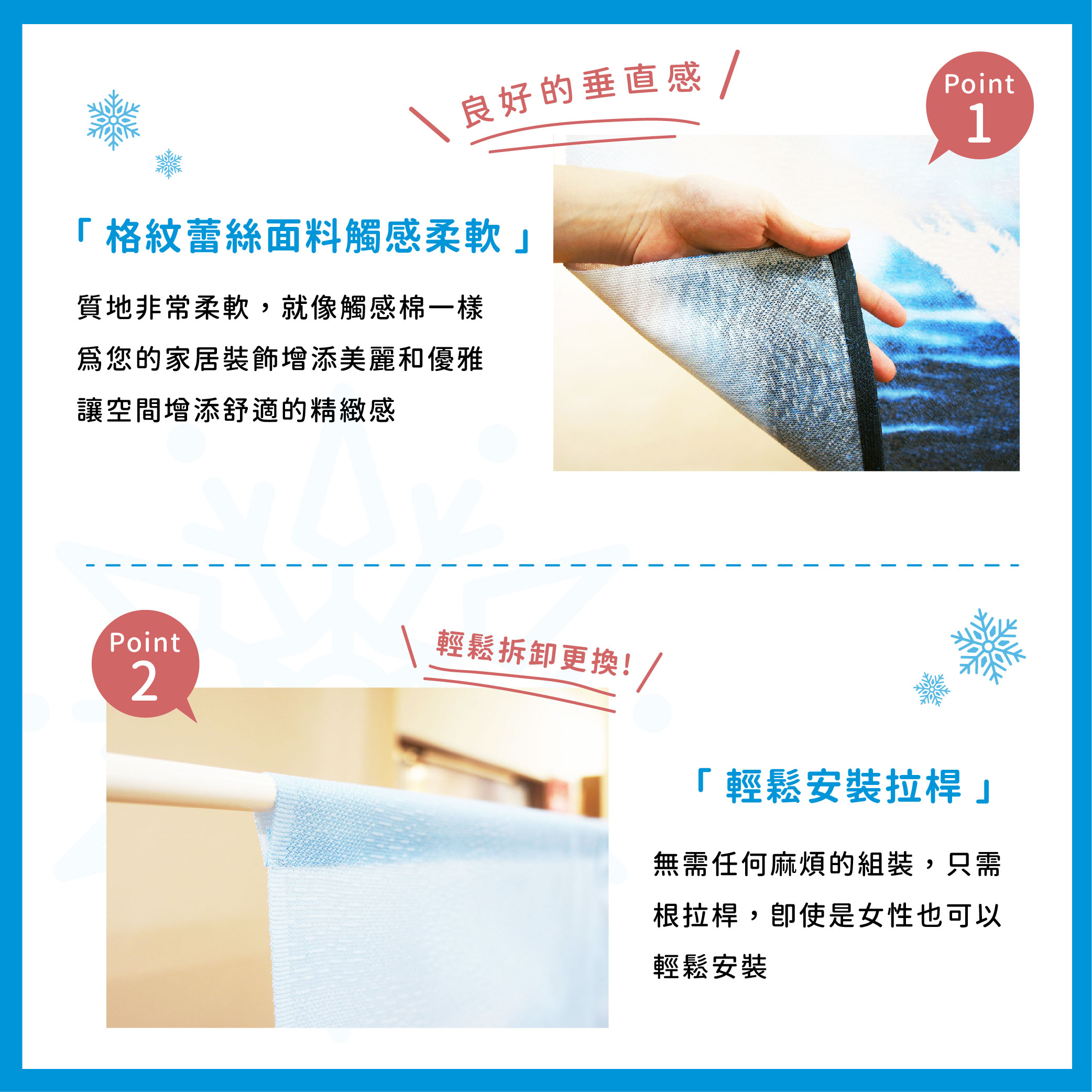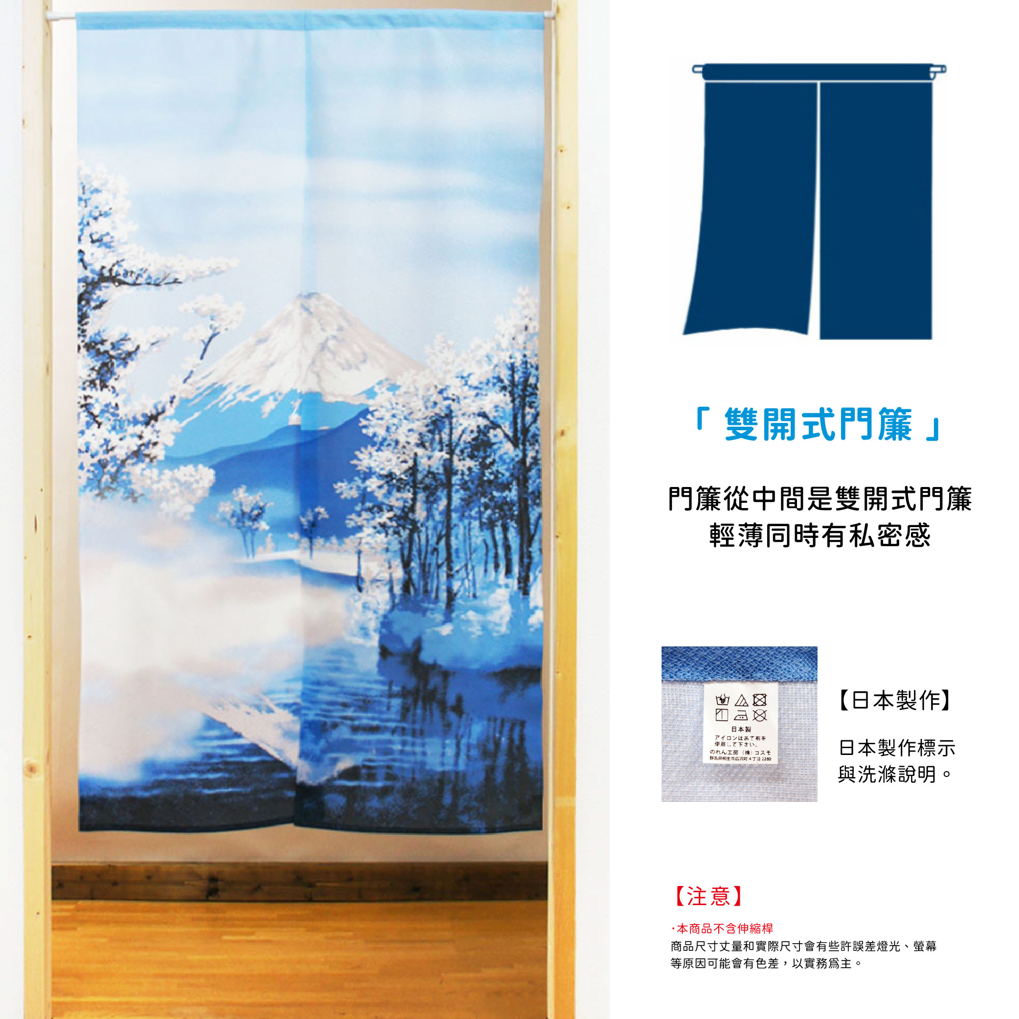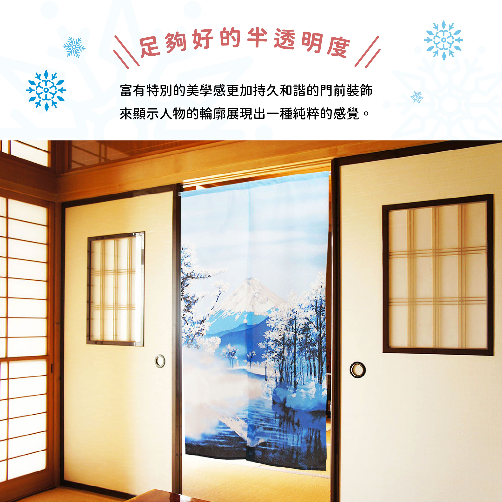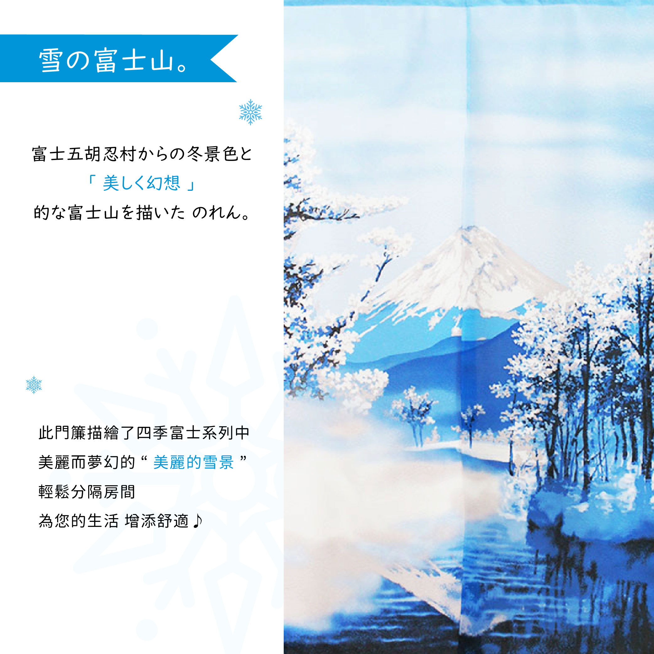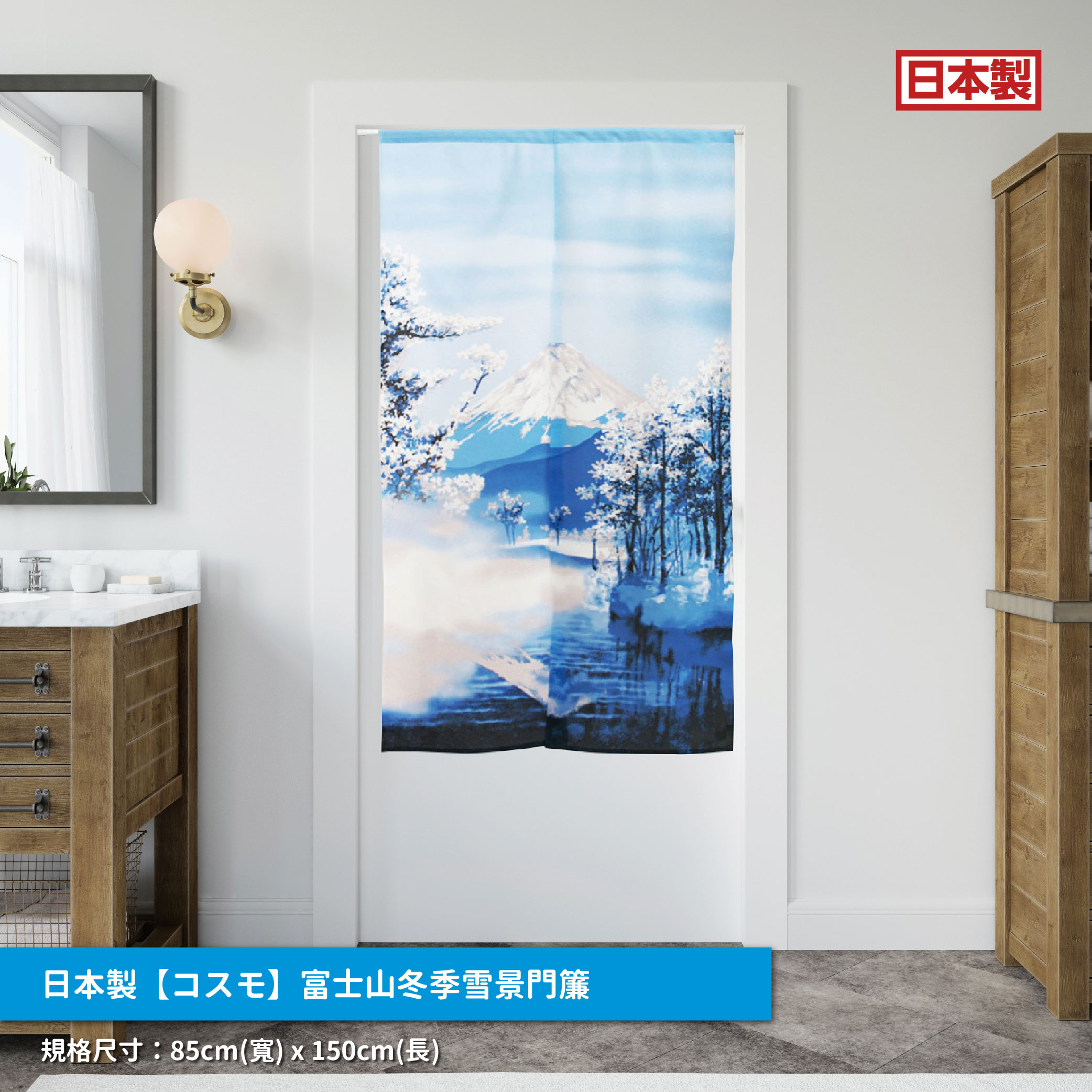 日本製【コスモ】長門簾《富士山冬季雪景》富士五胡忍村からの冬景色と美しく幻想的な富士山を描いた のれん。四季富士シリーズの冬。儚く美しい雪景色をお楽しみください。また、生地は市松柄レースを使用。柔らかい手触りと、人物などシルエットでわかるくらいのほど良い透け感があります。描繪了富士山五湖忍者村冬季景色和美麗夢幻的富士山的門簾。四季富士山系列的冬天,欣賞轉瞬即逝、美麗的雪景。格紋蕾絲布料觸感柔軟。有一種純粹半透明的的透明度來顯示人物的輪廓。生產國: 日本材質/成分:100%聚酯纖維%包裝:獨立袋包裝尺寸約:85 公分(寬)x 150 公分(長)國際條碼:4943741000792自行購買伸縮桿安裝適用:臥室門、廚房門、浴室門、衣櫥、玄關入口...等