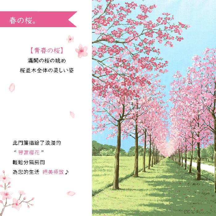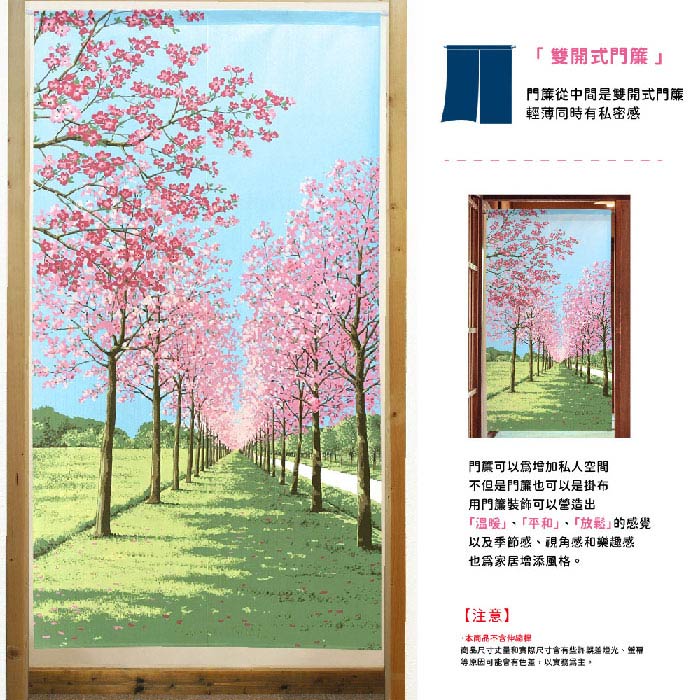 日本製【コスモ】長門簾《櫻花漫步》自然にあふれた風景や外国の街並み、世界遺産などを取り揃えた『風景のれん』シリーズ。自然豊かなデザインは癒しの空間に。海外の庭園や風景、世界遺産のデザインは旅行気分に。縦にストライプ状のレース編模様がある、編みレース生地を使用。レース生地の中でもしっかりとした生地ですので反対側がシルエット調に見えるくらいの透け感があります。『暖簾の使い方はいろいろ』アパートの玄関を開けた時に室内が見えないように。ドアが無い空間の間仕切りに。収納棚の目隠しに。壁に掛けてポスターやタペストリーのように。「風景門簾」系列,以豐富的自然景觀山水、異國都市風景、世界遺產等為主題充滿自然氣息的設計,營造出輕鬆的空間。海外花園、風景、世界遺產的設計,讓你有一種在旅行的感覺。採用針織蕾絲布料製成,帶有垂直條紋蕾絲編織圖案,它是蕾絲面料中比較堅固的面料,它是如此透明,以至於另一面看起來像剪影。【門簾可以用於多種方式】當前門打開時隱藏公寓的內部你就看不到裡面的狀況用於無門分隔空間用於隱藏儲物架將其像海報或掛毯一樣掛在牆上木頭 / 自然 / 治癒 / 圖片生產國: 日本材質/成分:100%聚酯纖維包裝:獨立袋包裝尺寸:約85 公分(寬)x 150 公分(長)國際條碼:4943741953975出貨:門簾*1件清洗方式:可水洗、不可漂白、不可烘乾顏色:如圖,網頁產品因拍攝與各顯示器顯色不同關係,與實品略有差異, 此商品圖為參考用之情境圖示,產品內容以規格敘述內容為準適用:臥室門、廚房門、浴室門、衣櫥、玄關入口...等【注意事項】伸縮桿需自備,商品內容為門簾本體並無附桿子