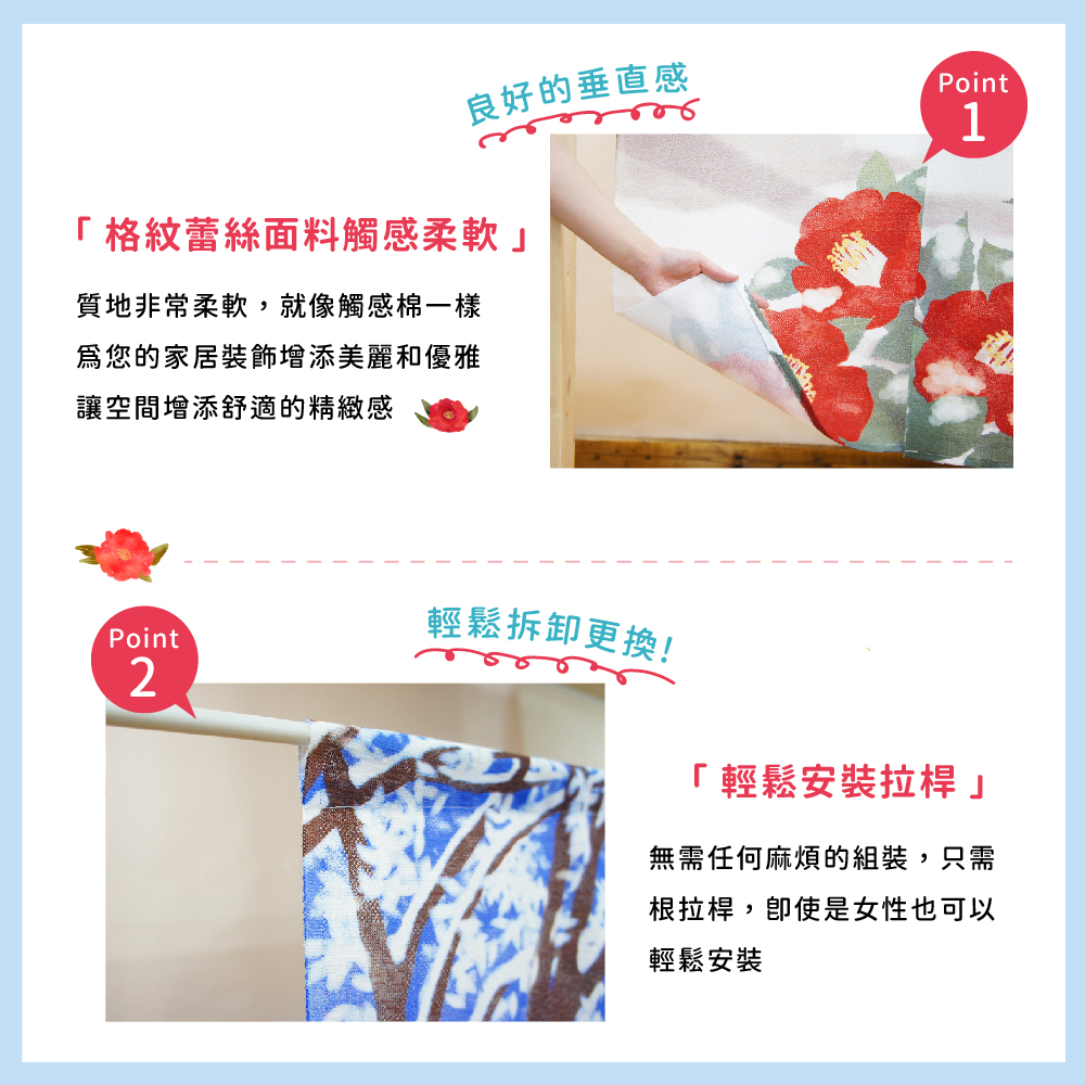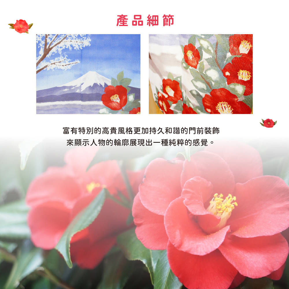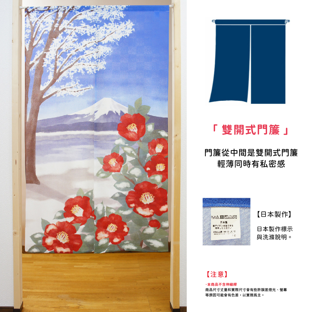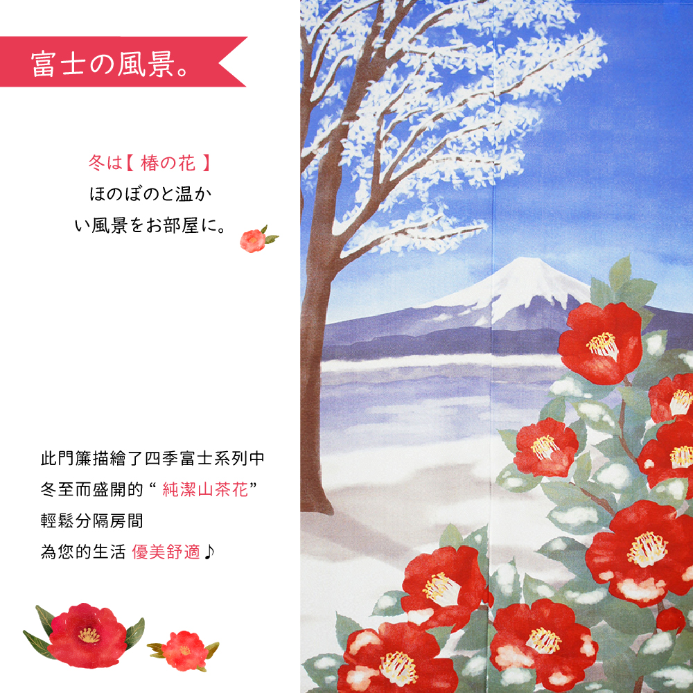 日本製【コスモ】長門簾《富士山冬天山茶花》イラストレーター『山中奈緒子』による四季折々の富士の風景。冬は【椿(つばき)の花】ほのぼのと温かい風景をお部屋に。是由插畫家山中直子描繪富士山四季的景色此描繪為冬天的山茶花為您的空間帶來溫馨的風景生產國: 日本材質/成分:100%聚酯纖維包裝:獨立袋包裝尺寸:約85 公分(寬)x 150 公分(長)國際條碼:4943741003564出貨:門簾*1件清洗方式:可水洗、不可漂白、不可烘乾顏色:如圖,網頁產品因拍攝與各顯示器顯色不同關係,與實品略有差異, 此商品圖為參考用之情境圖示,產品內容以規格敘述內容為準適用:臥室門、廚房門、浴室門、衣櫥、玄關入口...等【注意事項】伸縮桿需自備,商品內容為門簾本體並無附桿子