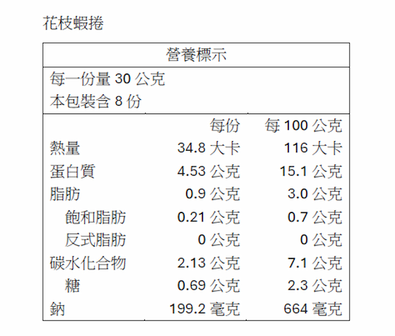 成分:蝦仁、花枝、魚漿、荸薺、豬背脂(台灣)、豆皮、馬鈴薯澱粉、韭黃、糖、味醂(果糖、水、糯米、米麴、鹽)、香菜、鹽、胡椒、香油(大豆油、白芝麻油)、蛋白粉、柑橘纖維、酵母萃取物