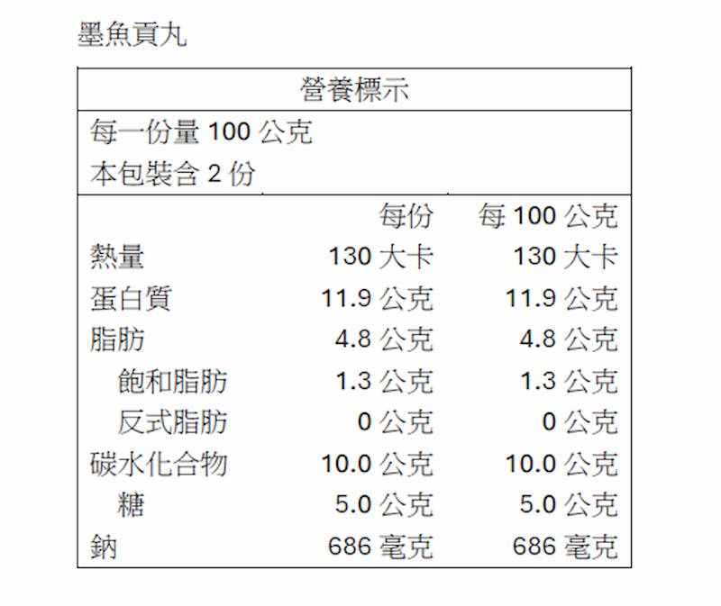 成分:花枝、魚漿、豬背脂(台灣)、馬鈴薯澱粉、糖、鹽、花枝墨囊、味醂(果糖、水、糯米、米麴、鹽)、結著劑(焦磷酸鈉、偏磷酸鉀、多磷酸鈉)