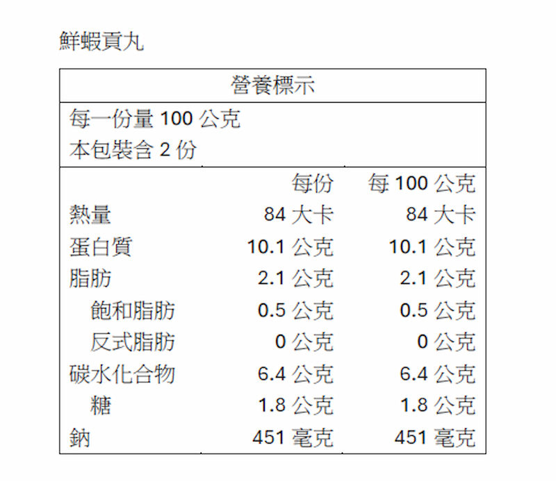 成分:蝦仁、魚漿、豬背脂(台灣)、馬鈴薯澱粉、糖、鹽、芹菜、辣椒、味醂(果糖、水、糯米、米麴、鹽)、香油(大豆油、白芝麻油)、結著劑(焦磷酸鈉、偏磷酸鉀、多磷酸鈉)