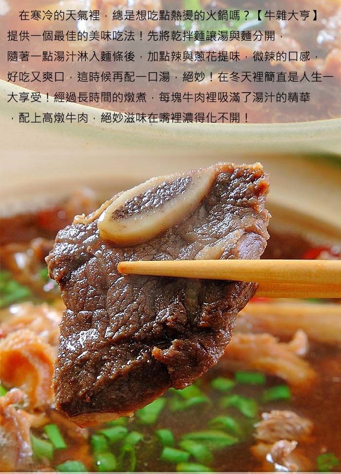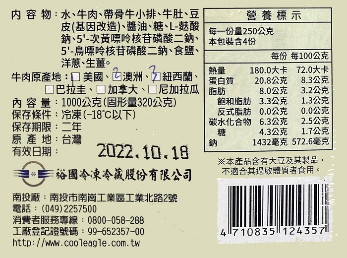 成分:水、牛肉、帶骨牛小排、牛肚、豆皮〈基因改造〉、醬油、二砂、洋蔥、生薑