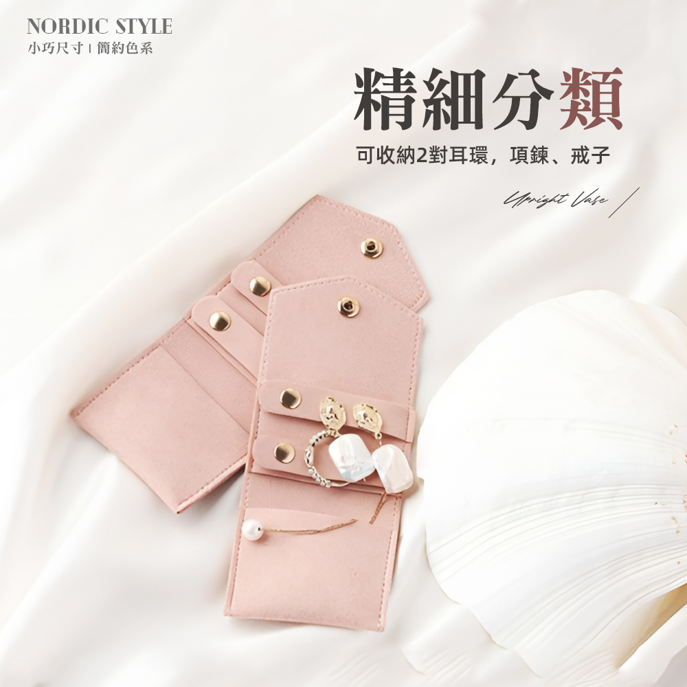 這款皮革飾品收納袋為輕巧5x6cm尺寸,小巧卻能收納耳環、項鍊、戒指不打架。內部夾層分區設計,避免糾纏;磁扣開關拿取方便,隨身放進包包也不怕壓壞。外皮為細緻皮革材質,時尚百搭,旅行、出差都能安心使用。