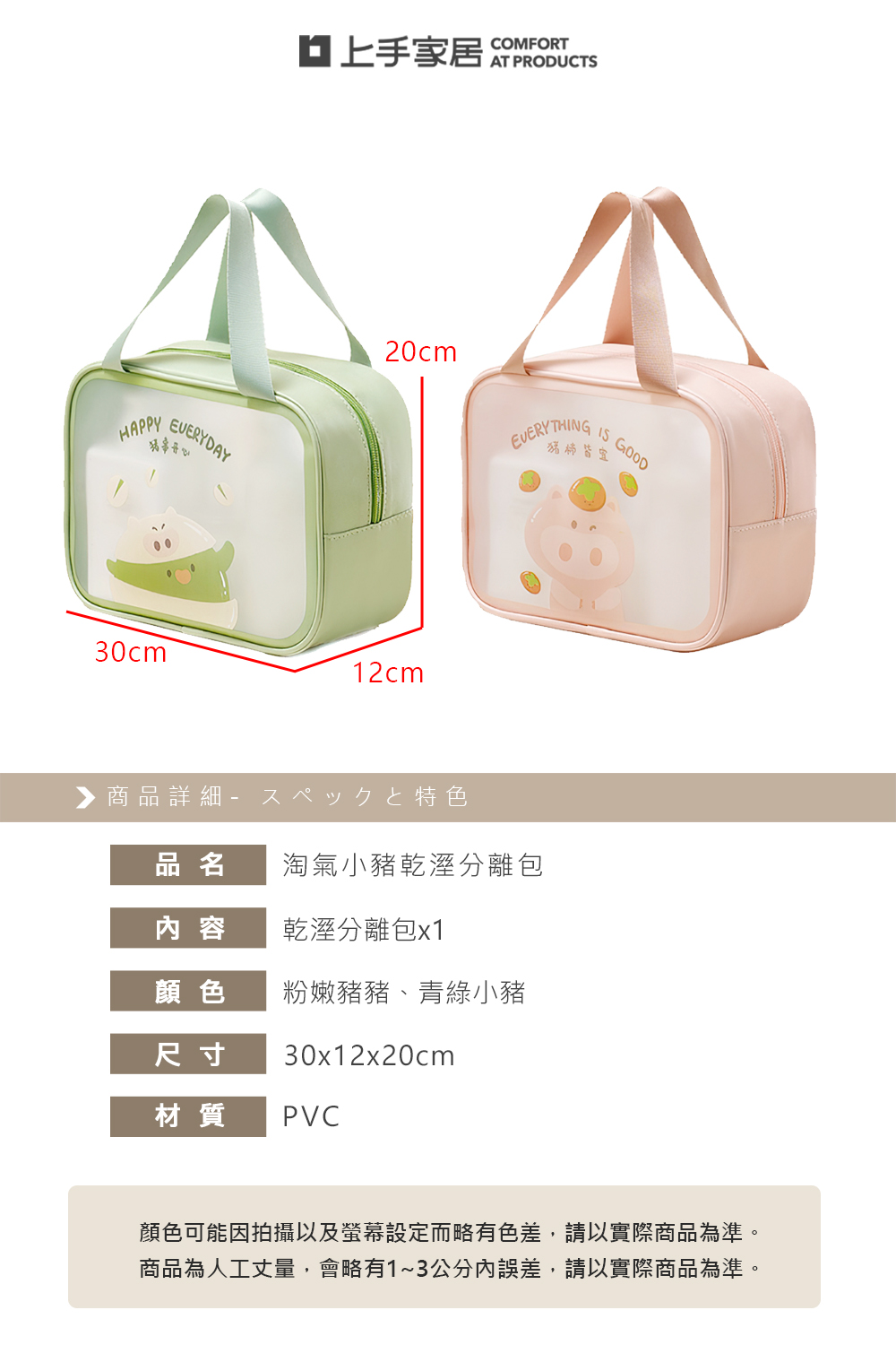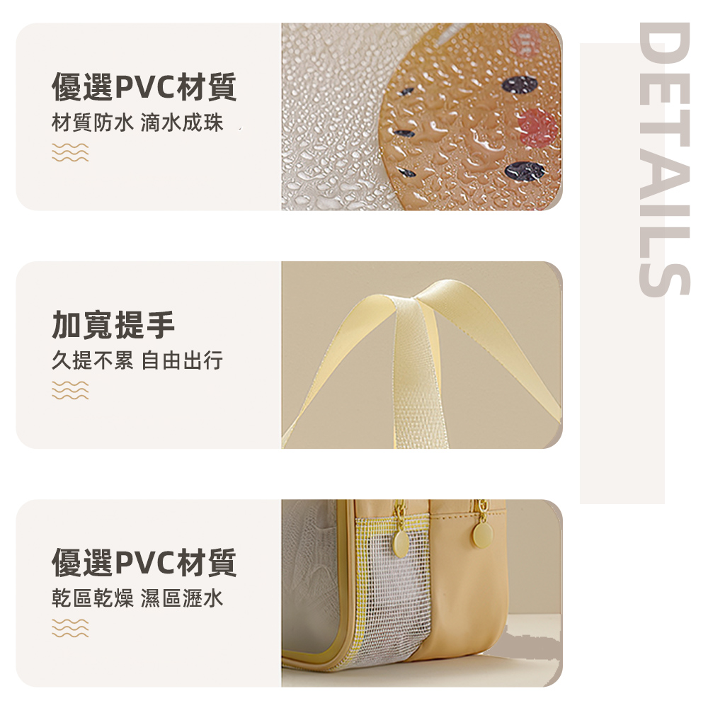 這款萌趣旅行包設有乾濕分區,濕毛巾與盥洗用品不再互相影響。PVC防水材質防污防滲,半透明霧面設計方便辨識內容物,輕巧耐用隨身攜帶不佔空間,不論健身、出差還是出遊,都能讓行李清爽有序。