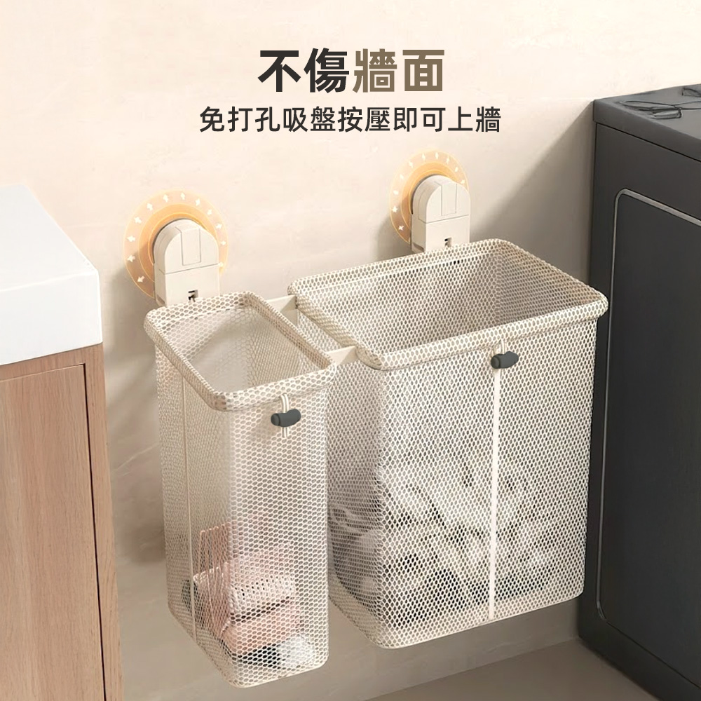 這款吸盤分格洗衣籃可直接吸附牆面使用,不需鑽孔、不傷牆面,將衣服與內衣褲分開收納,保持通風透氣,讓小浴室也能維持整齊清爽。