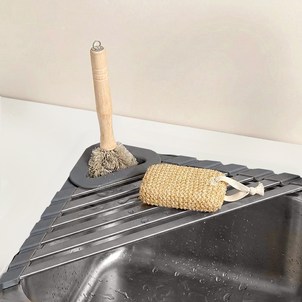 這款三角水槽瀝水架專為廚房角落設計,能有效利用閒置空間,無論是瀝乾碗盤、清洗蔬果或暫放廚餘都非常方便,徹底解決檯面濕滑雜亂的困擾。鋁合金條搭配矽膠邊條,穩固防滑不傷水槽,用完後輕輕一捲即可收納,不佔用寶貴的流理臺空間。