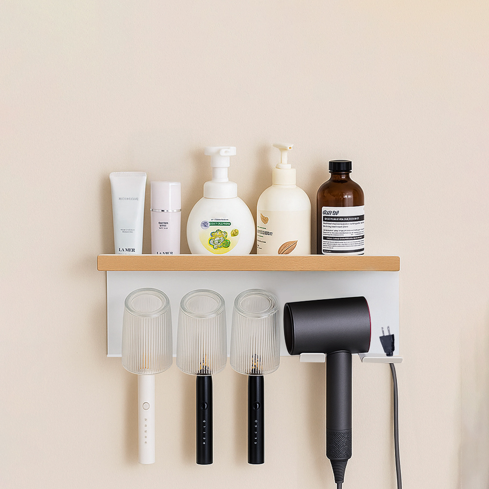 這款吹風機牙刷架採用太空鋁搭配櫸木設計,防水防鏽,兼具美觀與實用。上層可擺放洗漱用品與瓶罐,下層設有三格獨立牙刷位與專屬吹風機掛鉤,附免釘膠安裝更方便,輕鬆打造乾淨整齊的浴室空間。