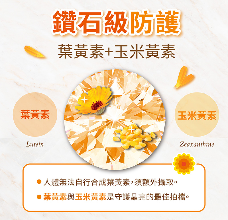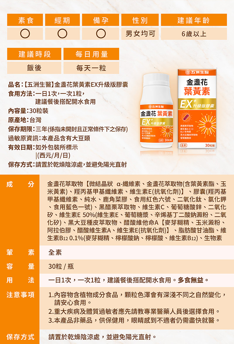 ◉商品成份:金盞花萃取物【微結晶狀α-纖維素、金盞花萃取物(含葉黃素脂、玉米黃素)、羥丙基甲基纖維素、維生素E(抗氧化劑)】、膠囊(羥丙基甲基纖維素、純水、鹿角菜膠、食用紅色六號、二氧化鈦、氯化鉀、食用藍色一號)、黑醋栗萃取物、維生素C、葡萄糖酸鋅、二氧化矽、維生素E 50%(維生素E、葡萄糖漿、辛烯基丁二酸鈉澱粉、二氧化矽)、黑大豆種皮萃取物、醋酸維他命A【麥芽糊精、玉米澱粉、阿拉伯膠、醋酸維生素A、維生素E(抗氧化劑)】、脂肪酸甘油酯、維生素B12 0.1%(麥芽糊精、檸檬酸鈉、檸檬酸、維生素B12)、生物素