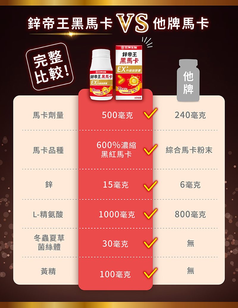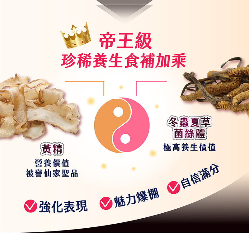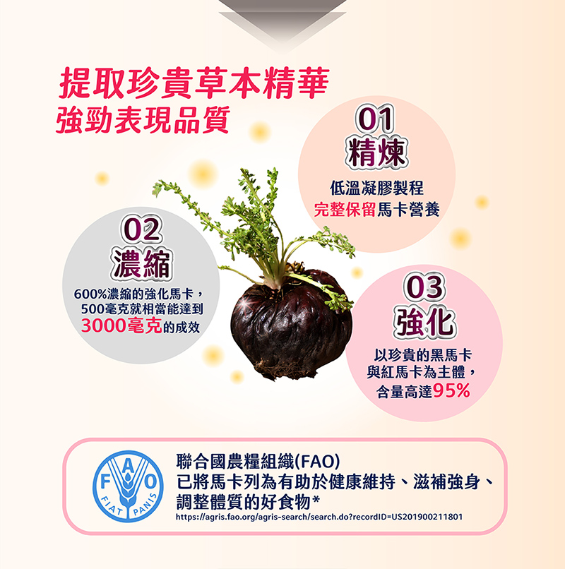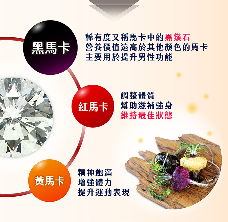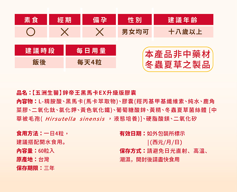 ◉商品成份:L-精胺酸、黑馬卡(馬卡萃取物)、膠囊(羥丙基甲基纖維素、純水、鹿角菜膠、二氧化鈦、氯化鉀、黃色氧化鐵)、葡萄糖糖酸鋅、黃精、冬蟲夏草菌絲體[中華被毛孢(Hirsutella sinensis,液態培養)]、硬脂酸鎂、二氧化矽