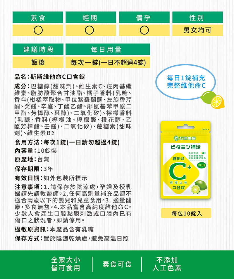◉商品成份:巴糖醇(甜味劑)、維生素C、羥丙甲纖維素、脂肪酸聚合甘油酯、橘子香料(乳糖、香料(柑橘萃取物、甲位紫羅蘭酮、左旋香芹酮、癸醛、辛醛、丁酸乙酯、鄰氨基苯甲酸二甲酯、芳樟醇、葉醇)、二氧化矽)、檸檬香料(乳糖、香料(檸檬油、檸檬醛、橙花醇、乙酸芳樟酯、壬醛)、二氧化矽)、蔗糖素(甜味劑)、維生素B2。