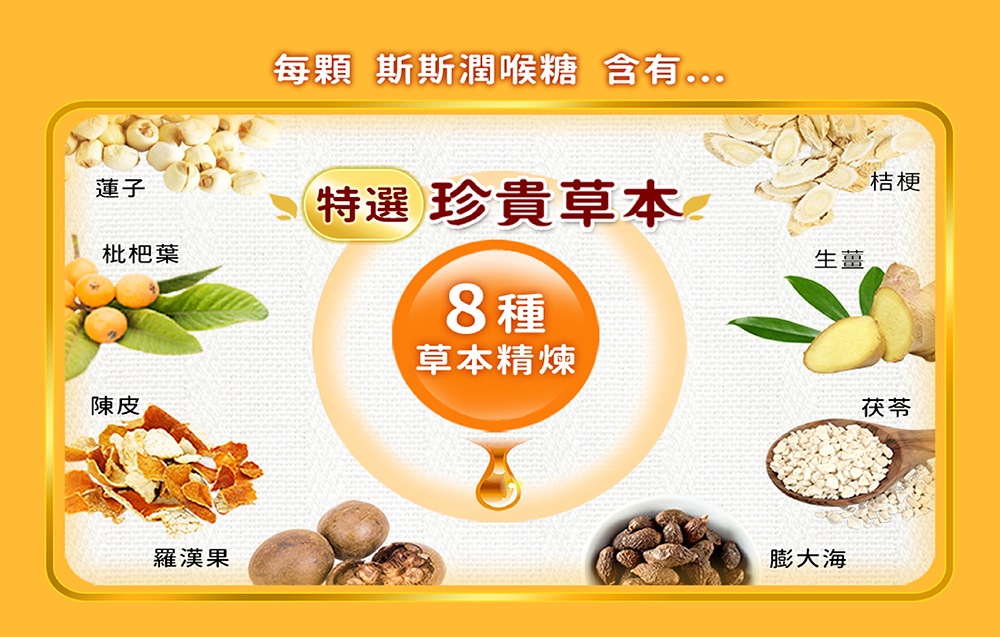 ◉商品成份:砂糖、麥芽糖、植物萃取物(枇杷葉、桔梗、茯苓、陳皮、蓮子、羅漢果、膨大海、生薑)、香料、蜂蜜、焦糖色素 ( 純砂糖加熱熬煮而成 ) 、薄荷