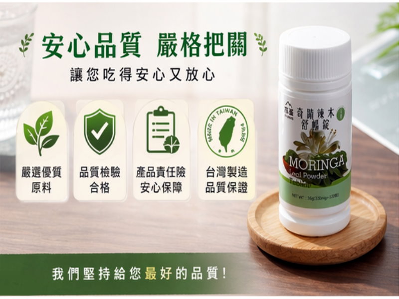 奇蹟辣木MORINGA 它也被稱為奇蹟樹,它是一種含有90多種營養素 和超過46種抗氧化劑的 超 級 食 物!!! 辣木不僅全株可食,「辣木葉」中更含有豐富的維生素 B 群、 A、C,礦物質如鉀、鈣、鐵、鎂、硒、鋅,以及多酚類和類黃酮等抗氧化物。此外,辣木還具有人體無法自行製造,須藉由飲食才能攝取到的其中八種必需胺基酸,也是素食者補充蛋白質的優良選擇之一。奇蹟 辣木舒暢錠採用辣木葉粉+綜合消化分解酵素+綜合蔬果酵素粉,促進腸道蠕動,使糞便比較柔軟而易於排出。維持消化道機能,改變細菌叢生態,營養價值高,通過SGS檢驗無重金屬、無農藥殘留,是全家大小養生保健的好產品!※全素可食,素食者的最佳營養補給!