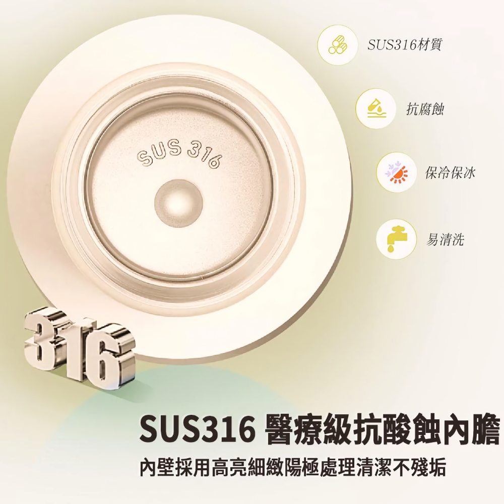 SUS316 是目前最高級別的食品級不鏽鋼,常用於醫療器械和高端食品容器。相較於一般 304 不銹鋼,耐腐蝕性更強,不怕酸鹼飲料、海鹽水,更安全無毒,不釋放有害物質,不易留異味,保持水質純淨。