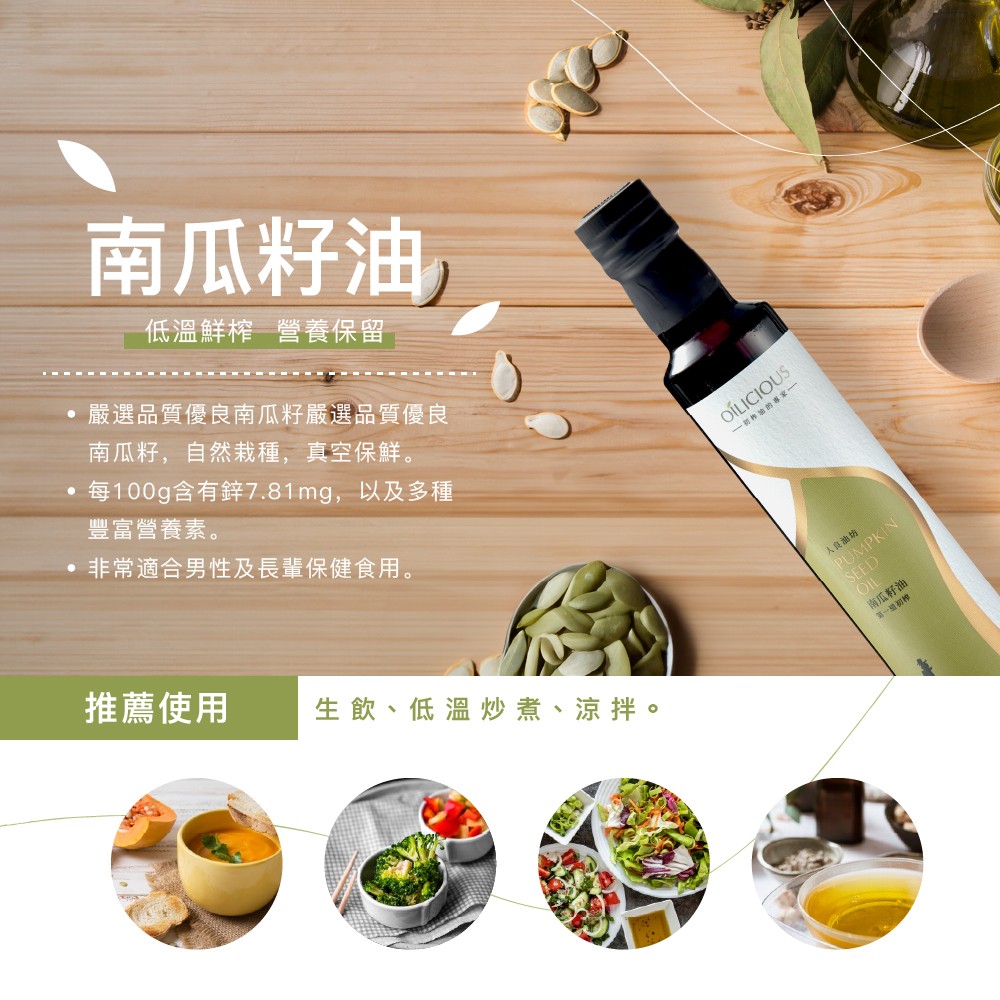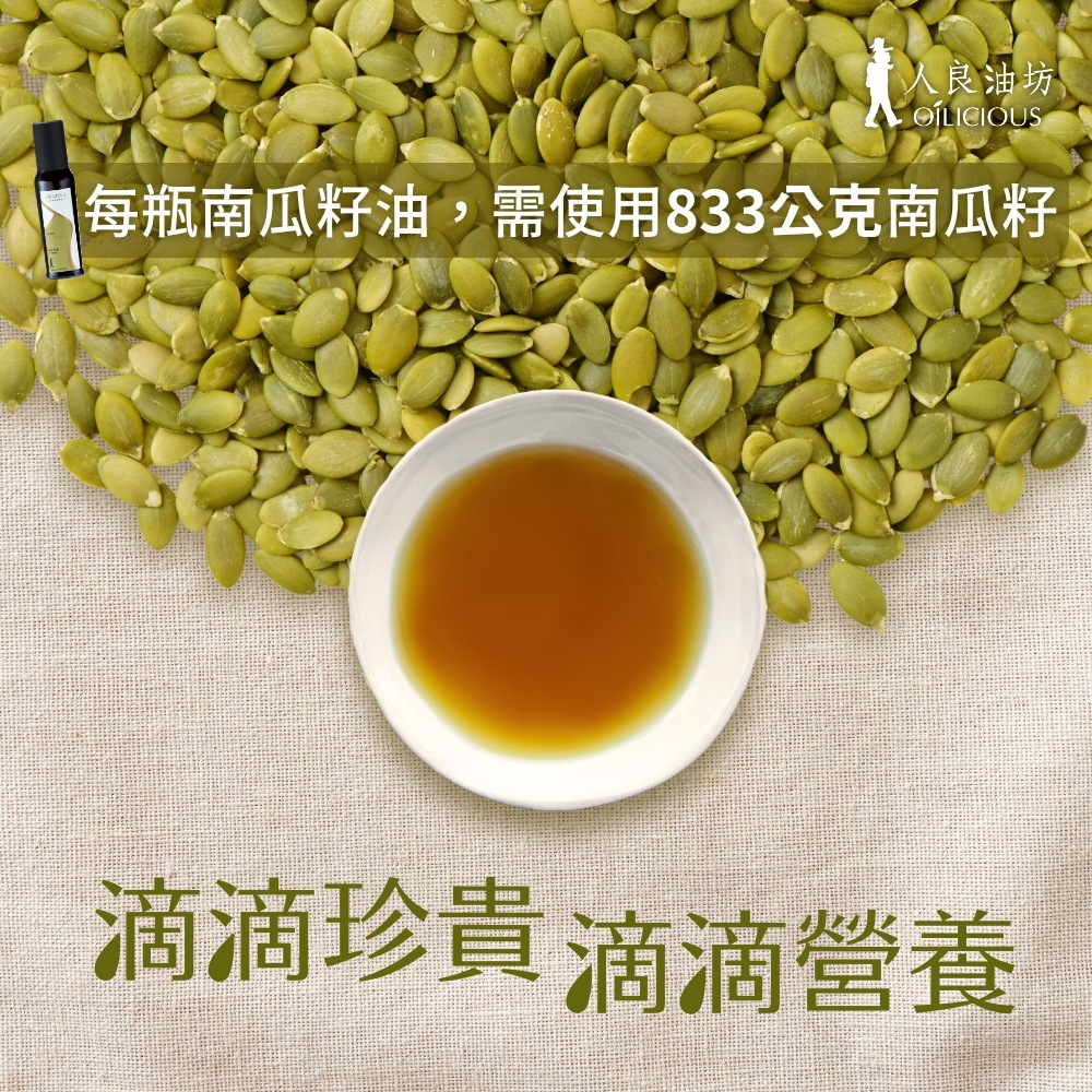 ‧專業輕焙製程,淺焙嚴選南瓜籽,濃郁堅果香氣‧純重力壓榨萃取出南瓜籽精華,清爽不膩口‧富含Omega6單元不飽和脂肪達54%以上‧富含鋅,男性及長輩日常呵護首選‧含多種維生素及礦物質,可生飲,營養價值高‧台灣在地生產,純物理重力壓榨,萃取第一道冷壓初榨油‧可生飲、煎炒烹飪、涼拌沙拉、低溫烘培、調味沾醬‧不透光瓶身設計,隔絕光線不易氧化