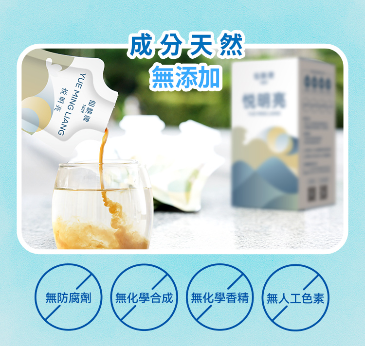 悅明亮原液(含石斛、黃耆、車前子、丹蔘、淮山、桑葚、茯苓、覆盆子、枸杞子、香櫞、菊花、蒼朮)、水、冰糖、黑醋栗濃縮汁