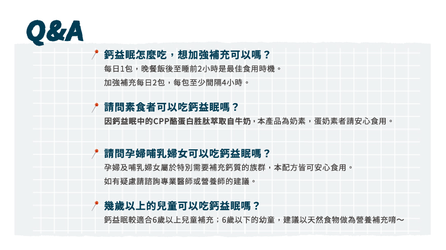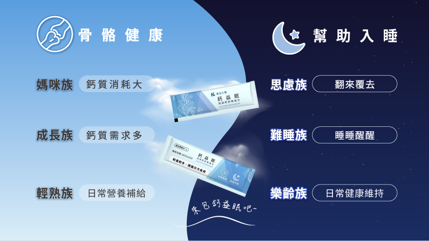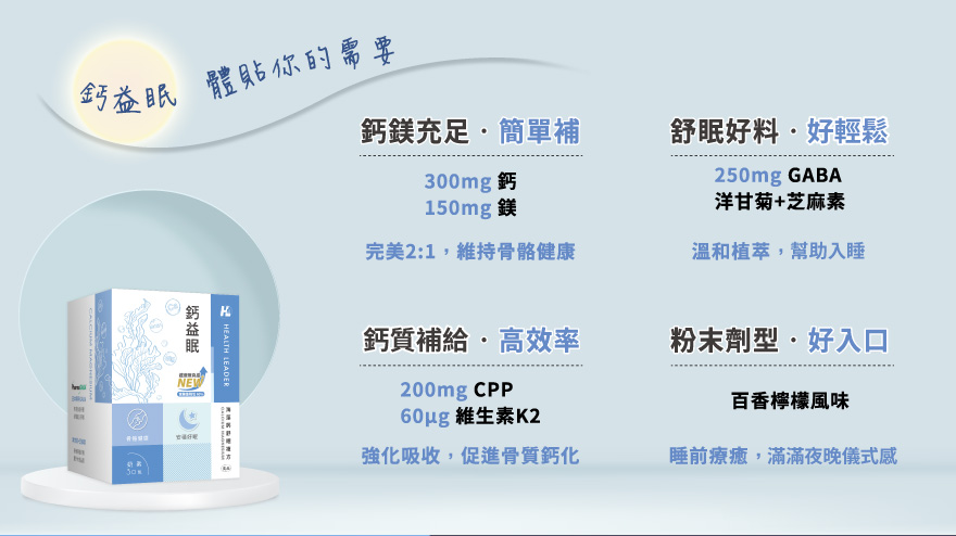 健康少負擔 X 全新升級含糖量降低60%(相較原版),使用赤藻糖醇取代部分蔗糖|鈣鎂充足|黃金2:1,補鈣維持骨骼健康|輔助幫手|強化吸收,幫助骨骼正常發育|入睡好料|溫和植萃,幫助入睡晚安!我的鈣,補充鈣質、幫助入睡!˙規格容量:一盒30包˙劑型:粉末(百香檸檬風味)˙食用方法:每日1包,晚餐飯後至睡前2小時是最佳食用時機加強補充每日2包,每包至少間隔4小時