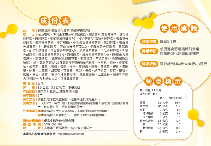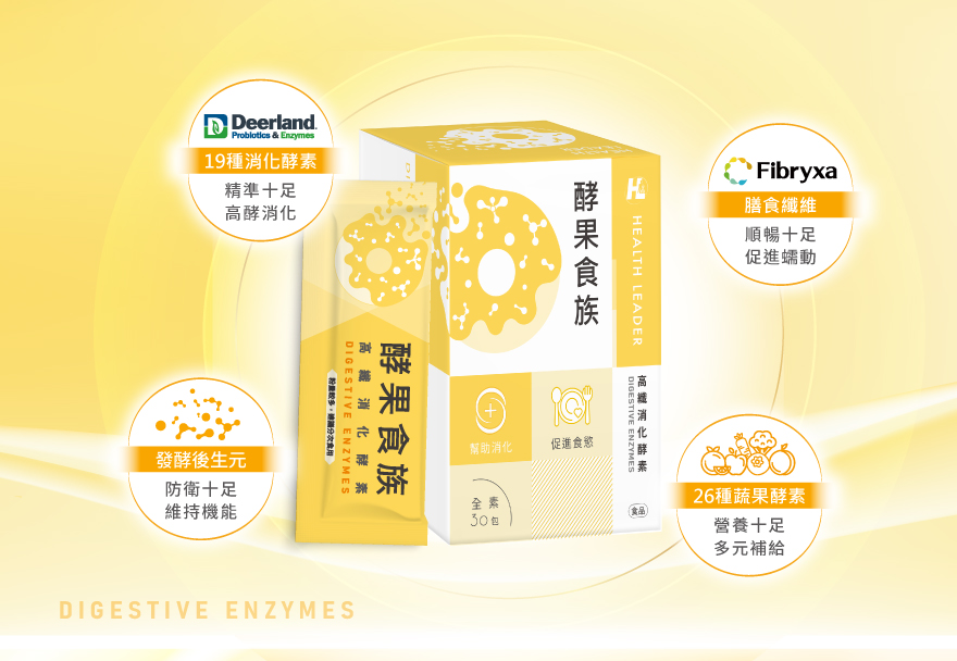 順暢|Fibryxa膳食纖維 可促進腸道蠕動 消化|Deerland19種消化酵素 幫助消化維持|發酵後生元 維持消化道機能營養|26種蔬果酵素 多元營養補給˙規格容量:一盒30包,每包3.8g˙食用方法:1天1-2次,每次1包促進食慾建議飯前食用;幫助消化建議飯後食用可直接口服,或搭配開水飲用