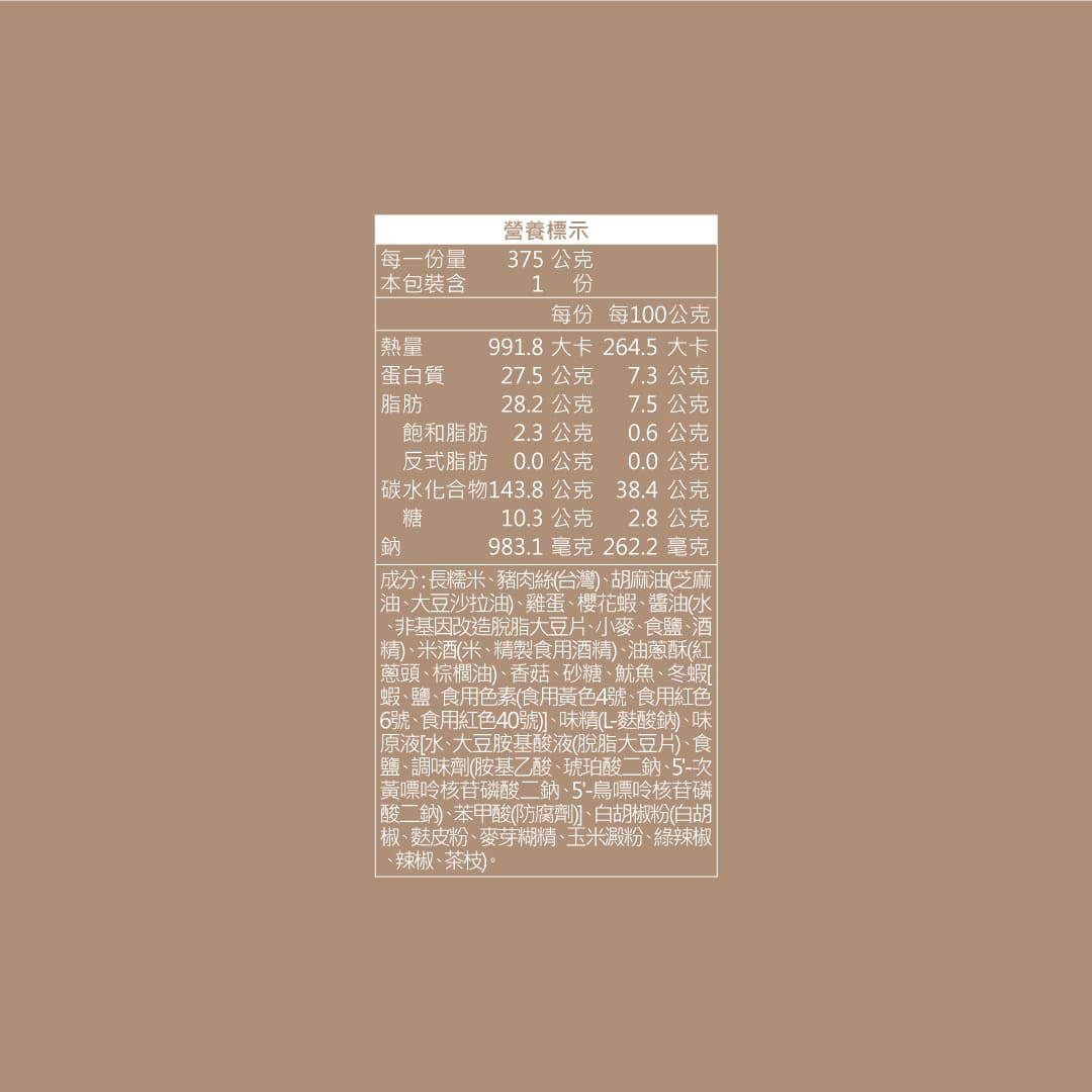 使用臺灣在地長糯米,粒粒香Q有嚼勁加入嚴選薄殼櫻花蝦,散發香濃甘甜滋味,增添油飯層次糯而不黏口感紮實,再加入麻油拌炒出濃厚米香