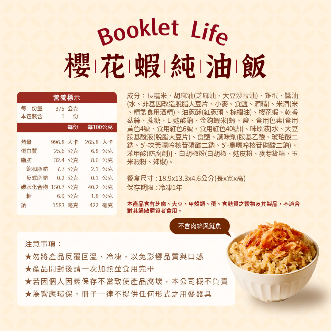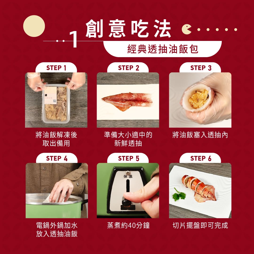 使用臺灣在地長糯米,粒粒香Q有嚼勁加入嚴選薄殼櫻花蝦,散發香濃甘甜滋味,增添油飯層次糯而不黏口感紮實,再加入麻油拌炒出濃厚米香
