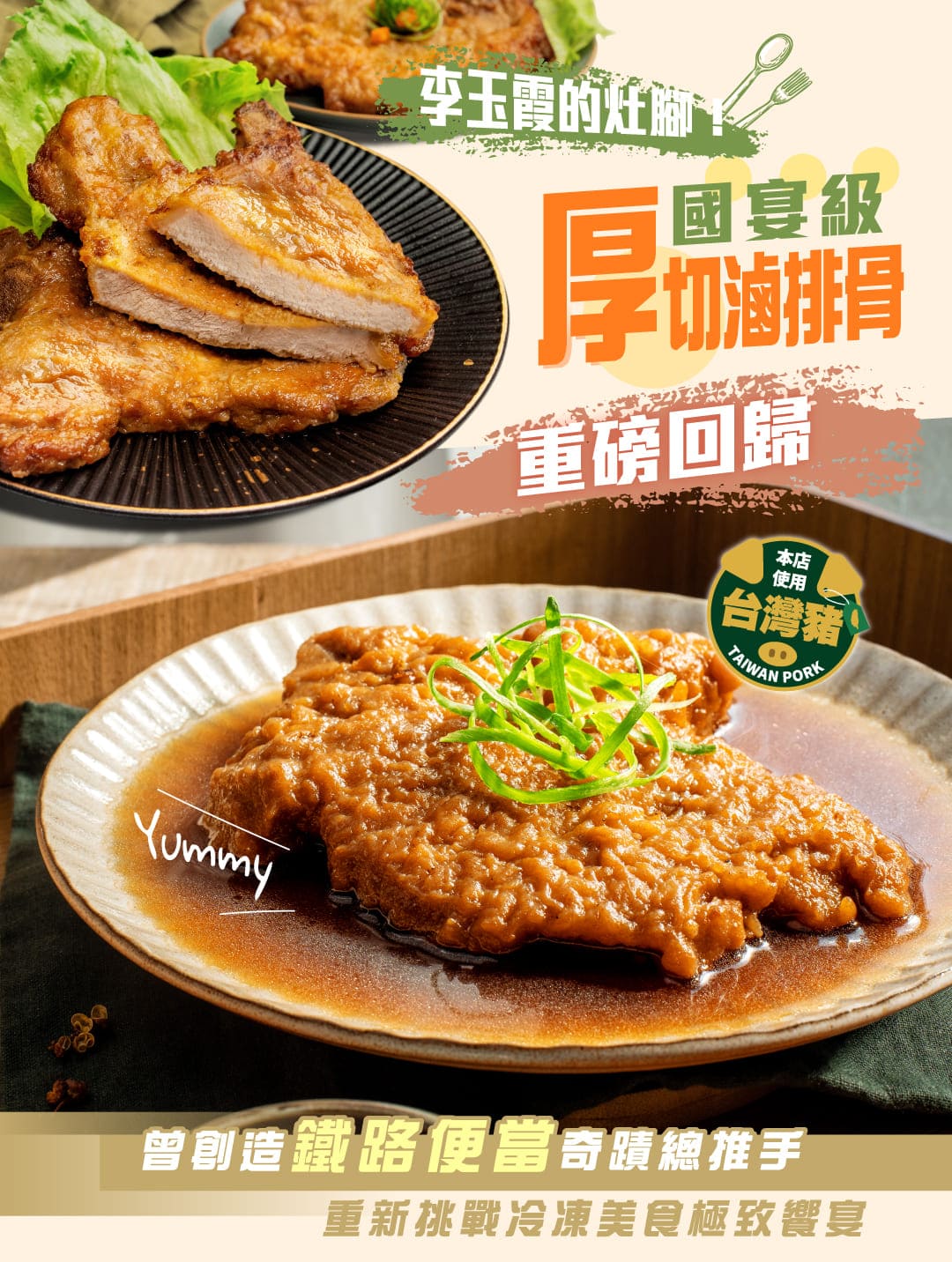李玉霞是成功扭轉台鐵餐廳虧損的功臣,靠著排骨打響台鐵便當名號頂級國宴御用,極上厚切排骨,在家也吃的到嚴選台灣國產豬,四大獨家技法用心研製薄粉上漿呈現厚實原色佐以獨門秘方醃料、滷汁燉煮而成