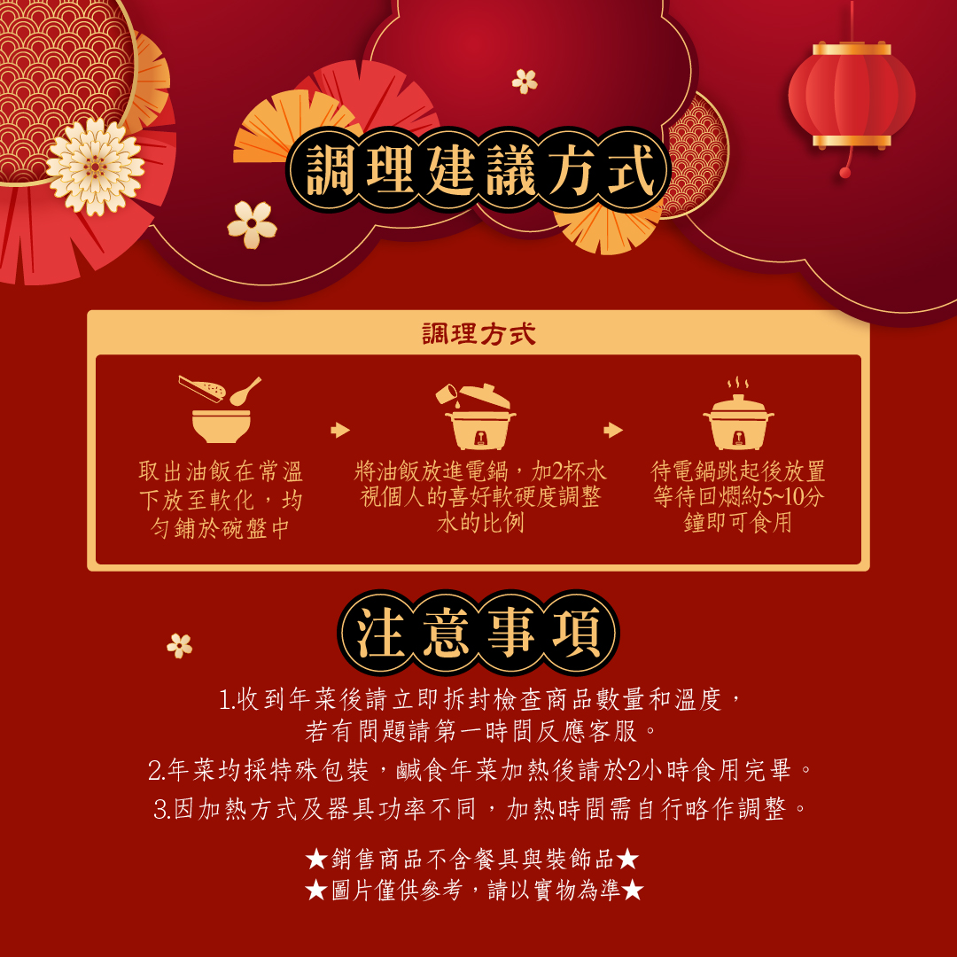 櫻花蝦油飯以鮮香入味,象徵喜氣步步高升;紫米干貝絲油飯以貴氣養生,寓意吉祥如意。兩款佳饌相映成趣,讓新年餐桌盡享海味豐盛與尊貴氣韻,開啟一年好彩頭—>大紅大紫🧨東港櫻花蝦的爽脆鮮香、干貝絲的豐富海味,完美融入每一粒香Q米飯,展現了海味的極致精髓,兩種口味鮮香四溢,口感豐富且層次分明,讓你一口接著一口。➺ 雙拼口味|一個套組2種口味,滿足你的味蕾➺ 櫻花蝦油飯|嚴選在地長糯米,淡淡米香,Q彈有嚼勁,搭配鮮香的櫻花蝦,每一口都令人回味。➺ 紫米干貝絲油飯|嚴選在地紫米,有獨特的清甜,口感Q彈,與干貝絲的結合,鹹香十足。➺ 精心講究|每口味獨立分裝,簡單加熱即可