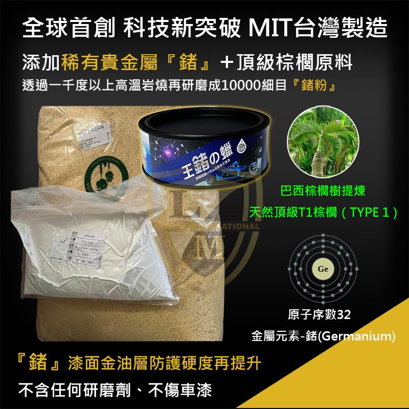 王鍺之蠟 愛車打蠟不踩雷、添加稀有類金屬「鍺」天然頂級T1棕櫚蠟 MIT台灣製造,克服所有市售蠟施工不易、效果不佳的問題,高分子奈米化擴散技術,能高密度深層導入與金油層緊密結合,讓板金漆面更紮實,漆面金油層防護硬度再提升、並且輕鬆達到絕佳亮度鏡面效果、完美光感折射率、提高抗紫外線能力、超強潑水性~粒粒珍珠~渾圓飽滿,乾、濕皆可輕鬆上蠟好下蠟、無油影、不惹塵,效果長達百天,可長時間面對戶外嚴苛環境,不含研磨劑、鍍膜、包膜,原廠消光車輛皆可放心使用,DIY就能有專業級防護效果。貼心專業小提醒:不論使用任何保養維護品,先將鐵粉,鐵屑,飛漆,工業落塵去除乾淨,更能達到產品最佳效果。車身,玻璃,大燈使用『MIT多國專利磁土布』;鋁圈、細縫難以去除之部位使用『中性鐵粉去除劑』,之後再上王鍺之蠟,這樣效果最好,最省錢。❶先用中性超濃縮洗車精將車徹底清洗,沖乾淨免擦乾。❷磁土布搭配一桶新的洗車泡沬作為潤滑媒介,以滑動的方式去除車漆、玻璃、大燈附著之鐵粉,然後用水沖乾淨即可。❸.再上薄薄一層王鍺之蠟,一般轎車全車打完即下蠟。王鍺之蠟施工方式:※不論乾上、濕上,先將打蠟海綿用清水沖乾淨,將打蠟海綿用濕不必擠乾直接沾蠟,然後以規律方向畫圓之方式下去均勻塗抺施作上蠟,夏季溫高半台車上完即可擦拭下蠟,請依正確施工方式施工更能逹到商品最佳效果。❶濕上:前置作業將車清洗乾淨後,殘餘水份不必擦乾即可上王鍺之蠟,夏季溫高半台車上完即可擦拭下蠟,溫度較低整台車上完立即擦拭下蠟。❷乾上:前置作業將車清洗乾淨後,將車子擦乾後再上王鍺之蠟,夏季溫高半台車上完即可擦拭下蠟,溫度較低整台車上完立即擦拭下蠟。※堆疊:王鍺之蠟第一次施工完成後,等待約15分鐘左右,待漆面吸收固化後再施作第二次堆疊、堆疊效果超級棒。適用範圍:汽機車烤漆鈑金件,烤漆內裝板件,燈殼,汽機車鋼圈,安全帽,原廠消光平光漆面,以及有金油烤漆平面材質皆可使用。注意事項:玻璃不可使用,建議使用奈米玻璃鍍膜塗層。外觀塑膠及內裝材質顆粒粗糙面不建議使用會造成白化,建議使用魔鍍塑膠鍍膜皮革保養組。商品規格:品名:王鍺之蠟容量:220g X1瓶,附贈上蠟海綿2個、雙層加厚下蠟布1條。產地:台灣保存期限:五年保存方式:放置陰涼處即可========================================品名:MIT多國專利磁土布尺吋:約30X32cm。產地:台灣保存期限:沒碰水可永久保存保存方式:放置陰涼處即可========================================品名:中性鐵粉去除劑容量:500ml產地:台灣保存期限:五年保存方式:放置陰涼處即可========================================品名:中性超濃縮洗車精容量:1000ml X1瓶。產地:台灣保存期限:五年保存方式:放置陰涼處即可⚠️「若國際海關因疫情影響進出口作業,賣家將保留變更贈品配件之權利」。