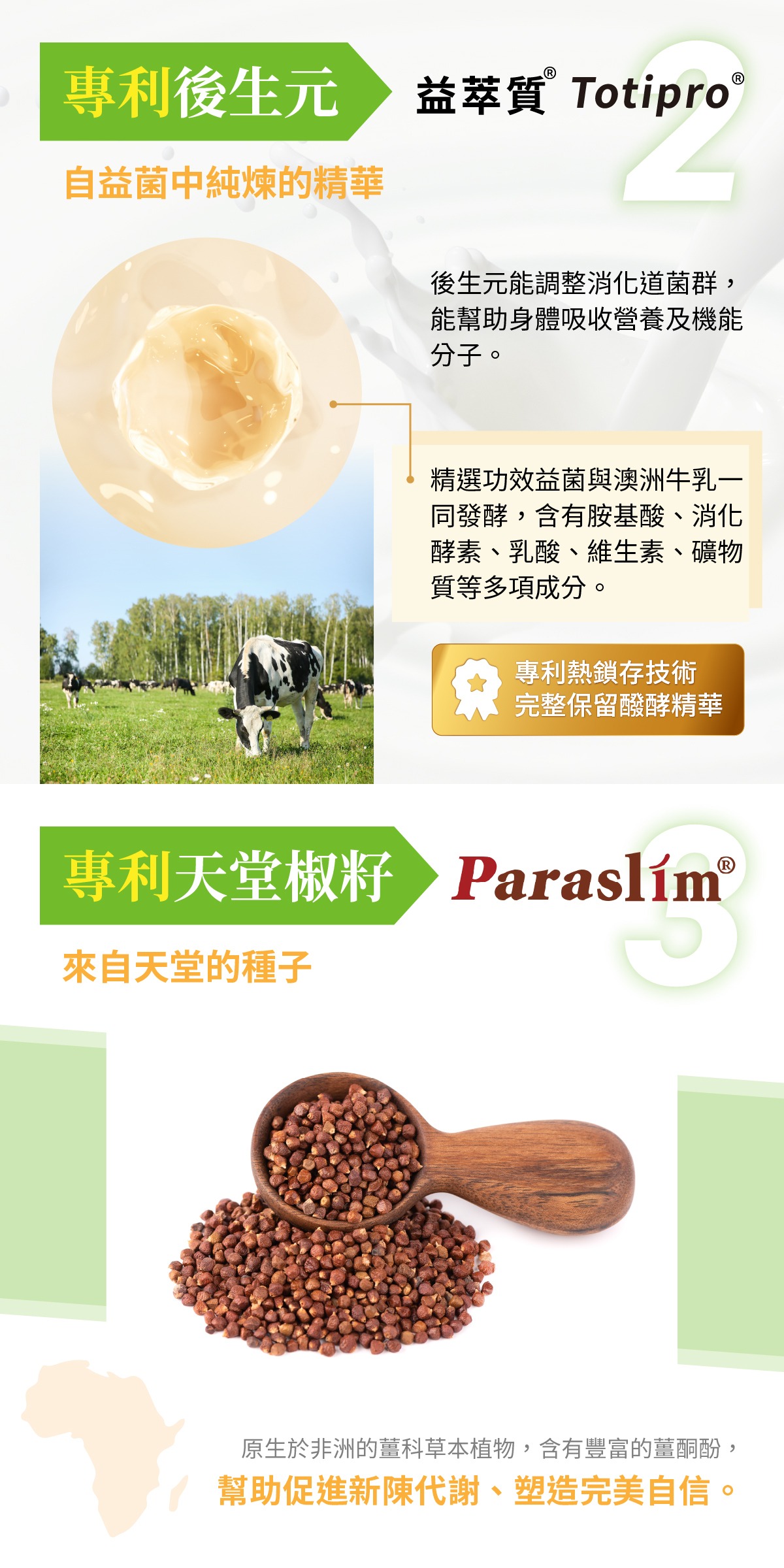 水、綜合莓濃縮汁(蘋果、蔓越莓、草莓、覆盆莓、櫻桃、黑醋栗、醋栗)、木醣醇(甜味劑)、Vitazyme20蔬果醱酵液 (菠菜、海茸、哈密瓜、鳳梨、冬瓜、甘藍、芹菜、甜瓜、小白菜、絲瓜、皇宮菜、薏仁、番茄、檸檬、蕪菁、萵苣、西瓜、蘿蔔、木瓜、瓠瓜)、菊糖、Totipro益萃質乳酸菌發酵物(熱滅活菌)PE0401(植物乳桿菌LPL28、唾液乳桿菌AP-32、長雙歧桿菌BLI-02、嗜酸乳桿菌TYCA06)、望江南萃取物(望江南萃取物、麥芽糊精)、難消化性麥芽糊精、鹿角菜膠、蒟蒻粉、玉米糖膠、刺槐豆膠、氯化鉀、ParaSlim天堂椒籽發酵液