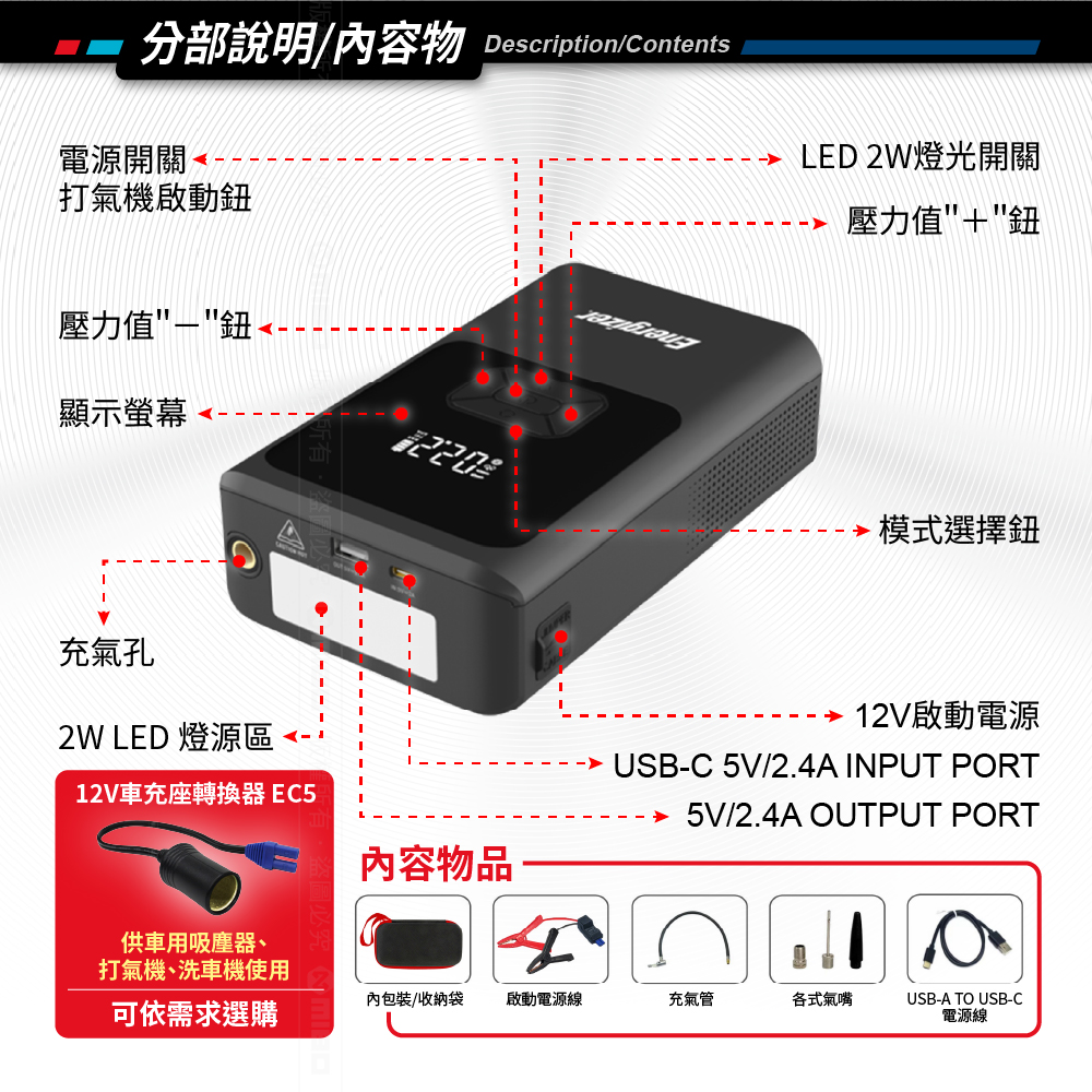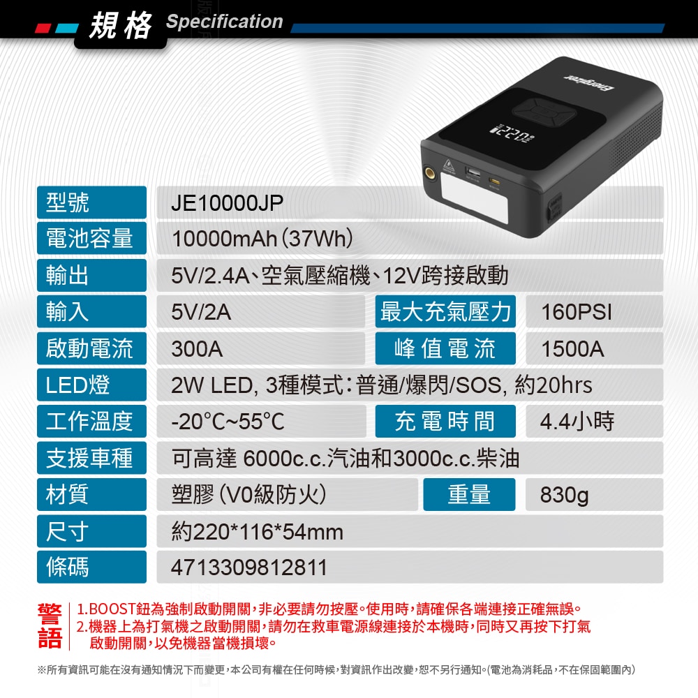 👍12V,300A啟動電流,峰值達1500A,可救援啟動6000CC以下汽車、3000CC以下柴油車。