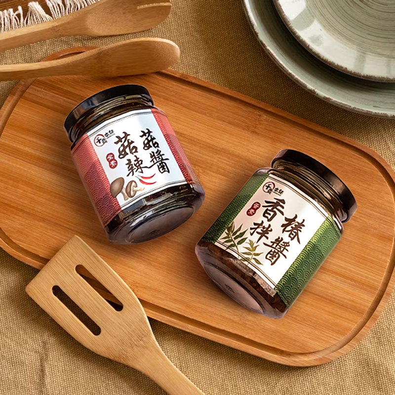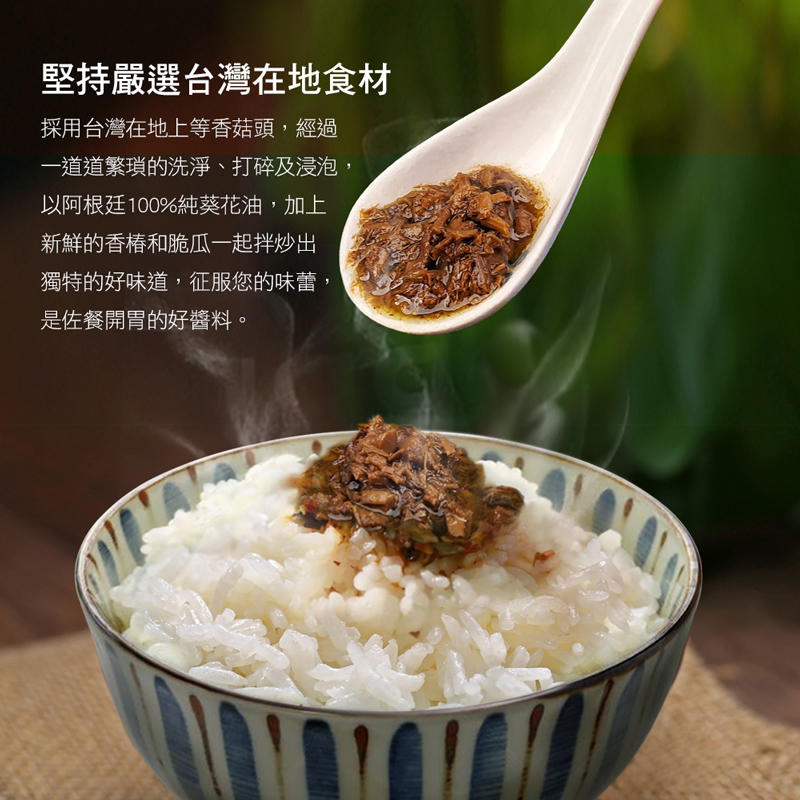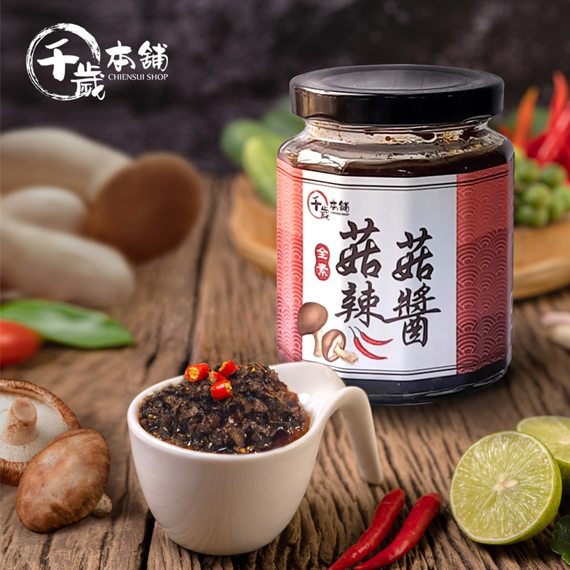 #沾醬#拌醬#拌麵#拌飯#調味【千歲本舖】香椿拌醬,是一款專為廚房媽媽開發的百搭醬料,無論是乾拌麵、湯麵、炒菜佐香都少不了它,白飯淋上香椿拌醬就是一碗香噴噴的清香飯,包粽子、包水餃連料都不用炒,有它就搞定了,更別說蘿蔔糕,芋頭糕…,有了這一罐香椿拌醬,您就是料理高手。 香椿的營養豐富,包含了粗纖維質,維生素C和胡蘿蔔素,及大量鈣、鐵、鎂、鈉等多種有益人體的元素。【千歲本舖】香椿拌醬嚴選台灣在地上等香菇頭,經過一道道繁瑣的洗淨,打碎,浸泡等動作,以阿根廷100%純正葵花油,加上新鮮香椿、脆瓜,以慢火炒出獨特的好味道,尾韻還有脆瓜的甘甜。香椿拌醬可蒸、煮、炒、拌,亦是佐餐開胃的最佳醬料。【千歲本舖】菇菇辣醬,是專為喜歡吃辣,又不敢太辣的人所精心研發。採用香氣內斂的台灣在地香菇,與Q勁口感的杏鮑菇,搭配非基改豆豉,和多種不同辣椒所創造出的層次感,嚐上一口瞬間開啟您深藏的味蕾,增添食慾與用餐樂趣,為了兼顧美味與健康,嚴選純釀醬油與來自阿根廷100%純正葵花油,不含味精、不添加防腐劑、甜味劑與人工色素,讓您吃得更安心。