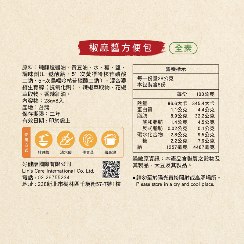 #全素#醬料包#佐餐#料理#拌麵#調味【 就醬拌,伴你度過每一餐 】就醬拌方便包使用各式香料,堆疊出富有層次的飲食特色,就算以簡單的烹煮方式調理,一樣可以變化出色、香、味俱全的美味料理。嚴選食材,打造茹素者可放心食用的純素醬料,無論是拌麵、拌菜,或是加入湯裡作為調味都合適,葷食者也能夠輕鬆入門喔! 陪伴你輕鬆完成料理,餐桌菜餚不再一成不變!就醬拌系列方便包,是你的最佳方便快速料理神隊友! 【 椒麻醬方便包 】以非基改「純釀醬油」為基底,搭配上微辣的「花椒紅油」,打造出兼具醬油甘醇醬香及椒麻誘人辛香,多重味蕾體驗的菜餚良伴,適量添加除了為食材提鮮,更可刺激萎靡的胃口,提振食慾,是一款令人回味無窮、餘韻連綿的拌醬。● 純釀手工、非基因改造醬油● 誘人辛香的花椒紅油● 花椒香氣足 麻辣指數一顆星● 適合不敢吃太辣又想要有點辣的你原料:純釀造醬油、黃豆油、水、糖、鹽、調味劑(5’一次黃嘌呤核苷磷酸二鈉、5’一次鳥嘌呤核苷磷酸二鈉)、混合濃縮生育醇(抗氧化劑)、辣椒萃取物、花椒萃取物、香辣紅油。內容量:28g/包(一袋共 8 包),三袋組有效期限:印於袋上保存期限:兩年■ 廠商名稱 : 好健康國際有限公司■ 廠商電話 : 02-26755234■ 廠商地址 : 238新北市樹林區千歲街57-7號1樓■ 投保產品責任險字號 : 0525字第23AML0004952-2號■ 食品業者登錄字號 : H-153997270-00000-7