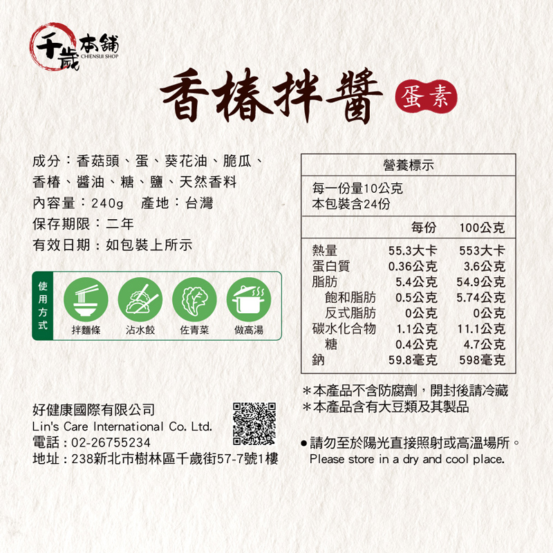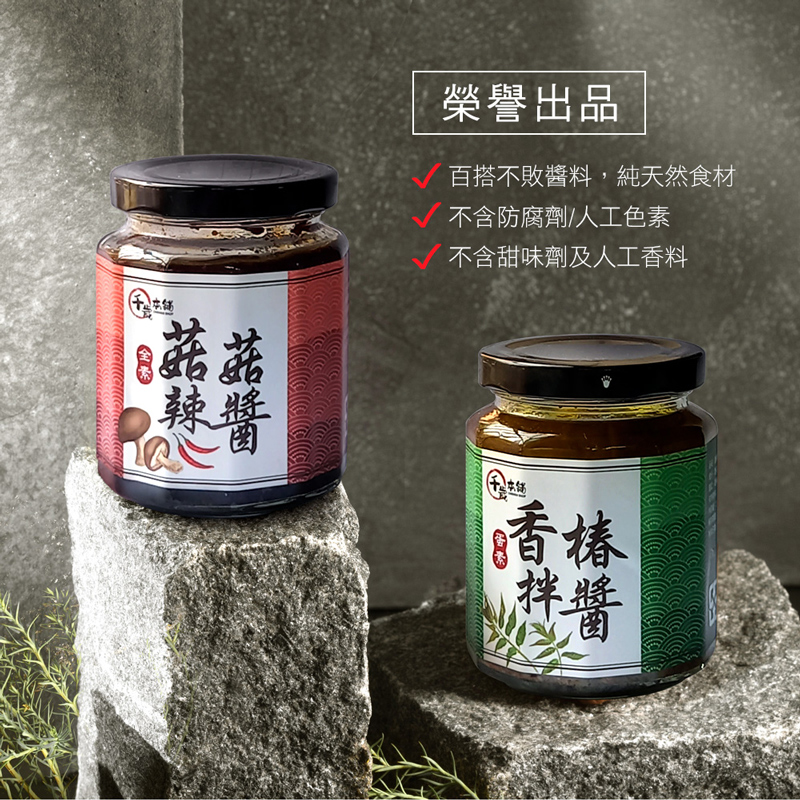 #蛋素#沾醬#拌醬#拌麵#拌飯#調味【千歲本舖】香椿拌醬,是一款專為廚房媽媽開發的百搭醬料,無論是乾拌麵、湯麵、炒菜佐香都少不了它,白飯淋上香椿拌醬就是一碗香噴噴的清香飯,包粽子、包水餃連料都不用炒,有它就搞定了,更別說蘿蔔糕,芋頭糕…,有了這一罐香椿拌醬,您就是料理高手。 香椿的營養豐富,包含了粗纖維質,維生素C和胡蘿蔔素,及大量鈣、鐵、鎂、鈉等多種有益人體的元素。【千歲本舖】香椿拌醬嚴選台灣在地上等香菇頭,經過一道道繁瑣的洗淨,打碎,浸泡等動作,以阿根廷100%純正葵花油,加上新鮮香椿、脆瓜,以慢火炒出獨特的好味道,尾韻還有脆瓜的甘甜。香椿拌醬可蒸、煮、炒、拌,亦是佐餐開胃的最佳醬料。【千歲本舖】菇菇辣醬,是專為喜歡吃辣,又不敢太辣的人所精心研發。採用香氣內斂的台灣在地香菇,與Q勁口感的杏鮑菇,搭配非基改豆豉,和多種不同辣椒所創造出的層次感,嚐上一口瞬間開啟您深藏的味蕾,增添食慾與用餐樂趣,為了兼顧美味與健康,嚴選純釀醬油與來自阿根廷100%純正葵花油,不含味精、不添加防腐劑、甜味劑與人工色素,讓您吃得更安心。