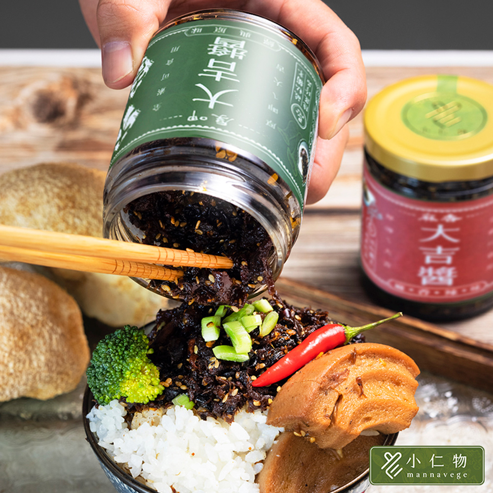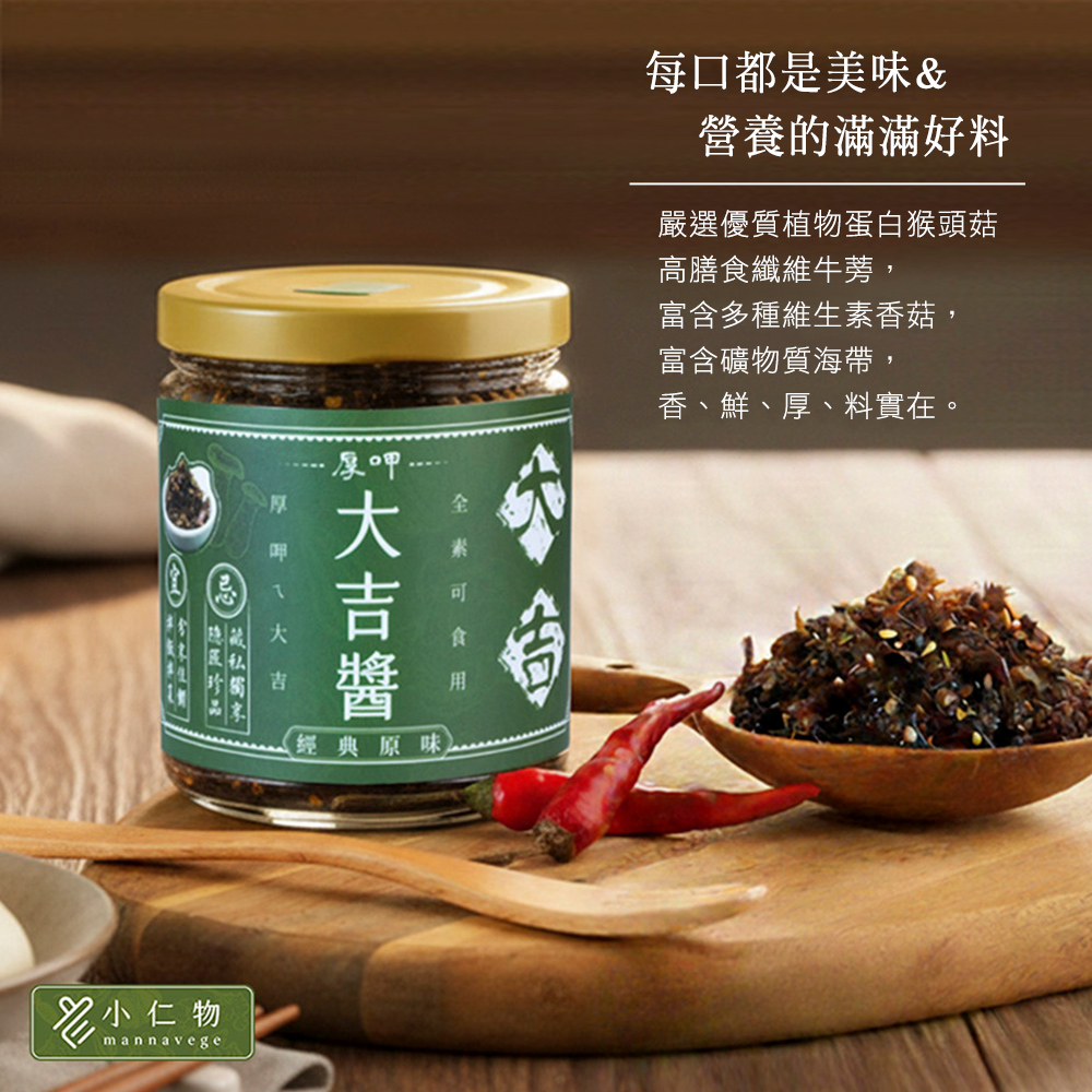 芥花油、牛蒡、杏鮑菇、香菇頭、猴頭菇、純釀造醬油(水、黃豆(非基因改造)、鹽、小麥)、海帶芽、紫蘇辣椒、辣椒粉、砂糖、冰糖、白芝麻、香椿(香椿、黃豆油)、花椒萃取物、混合濃縮生育醇(抗氧化劑)