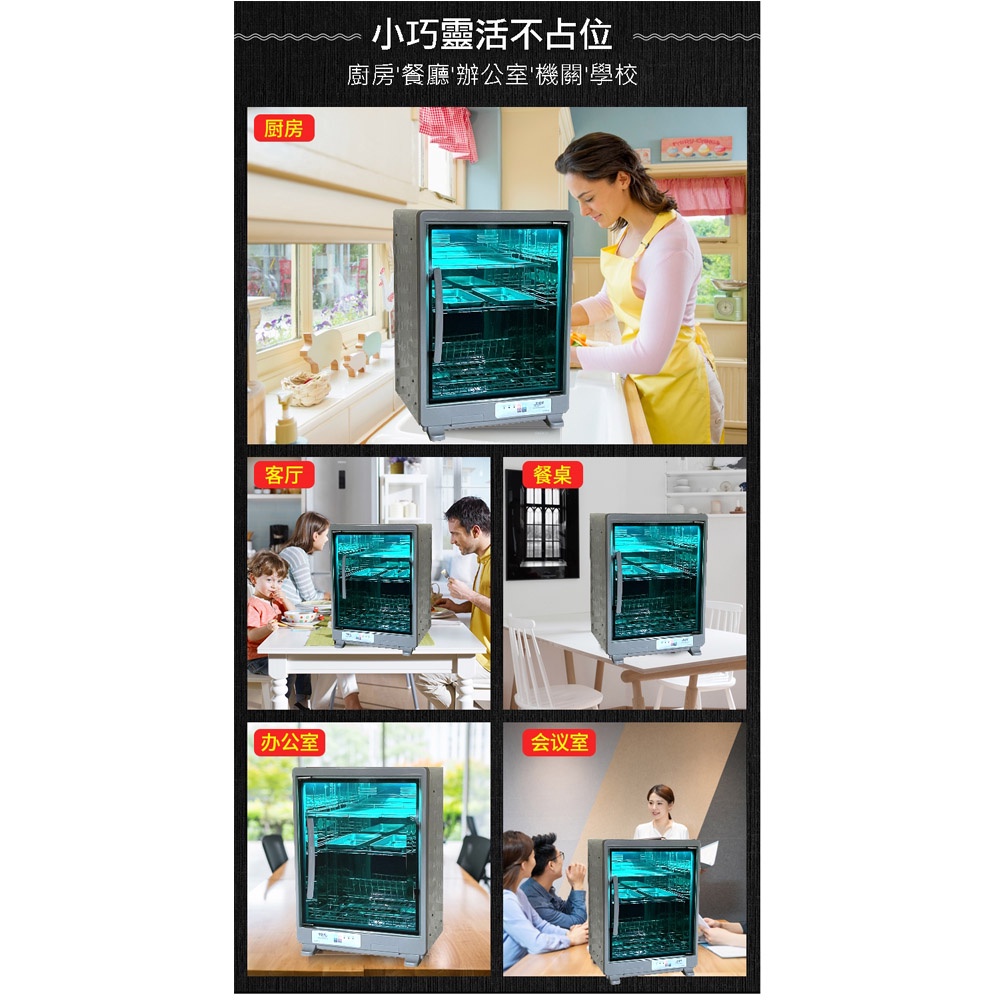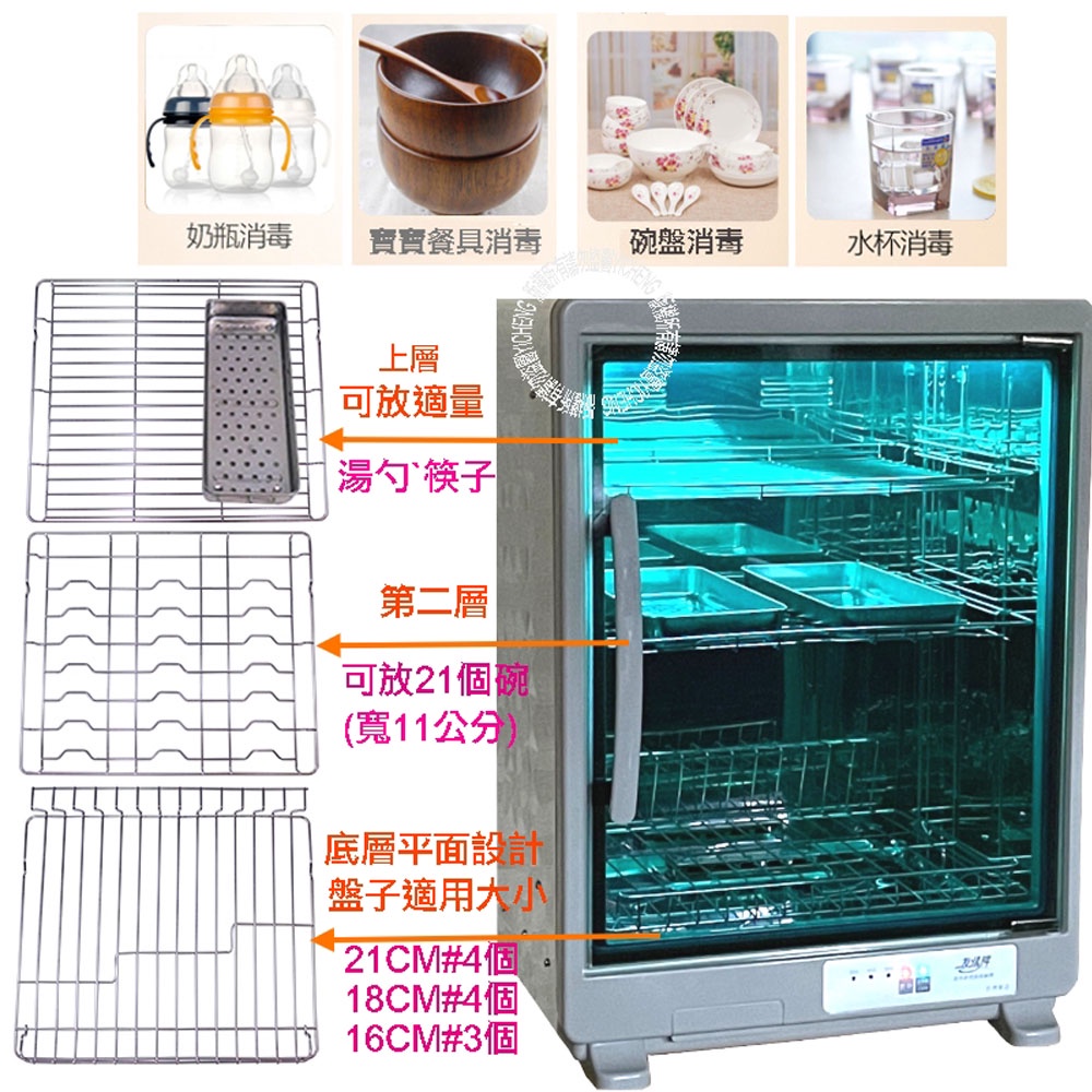 商品特色:友情品牌台灣在地40年老品牌正港MIT商品。(02000034)SGS設計、製程評鑑取得最新版ISO 9001 認証。標檢局內銷安規證號 R63163。73公升大容量+四層碗盤架設計,大量碗盤一次搞定正304不鏽鋼外殼,全天候防護,耐操、好用又乾淨。大三層(高61公分)、總容量(73公升約15~20人分)。微電腦控制4段定時(20/40/60/80分鐘),操作簡單直接。可依碗盤高度調整層架。貼心附贈#30#不鏽鋼筷盒,可單獨置放湯匙或筷子開門自動熄滅紫外燈,避免誤傷眼睛,安全無虞內裝使用正304鏡面不鏽鋼,殺菌無死角。採用飛利浦歐洲原裝16W紫外線殺菌燈管。具殺菌、除臭、防蟑三效合一加貼防爆安全膜,有效隔離紫外線,避免爆裂產生危險。使用耐熱防蟑密封墊套,安全、乾淨、衛生。商品規格:型號:電壓及頻率:110V/60HZ消耗功率:200W燈管規格:飛利浦T5(16W)紫外線殺菌燈管淨 重:9.25Kg容 量:73L產品尺寸:450*360*610(mm)商品保固:一年。貼心小叮嚀:夏天使用40分鐘、冬天使用60分鐘備註:獨立使用插座。禁止整機浸泡清洗。外出關機確保安全。本商品資訊由網路及官網收集彙整而成,僅供參考,如有更新或異動不另外通知,正確商品資訊及規格以實機為準。鑑賞期非試用期,產品一經使用皆會影響您退貨權利。