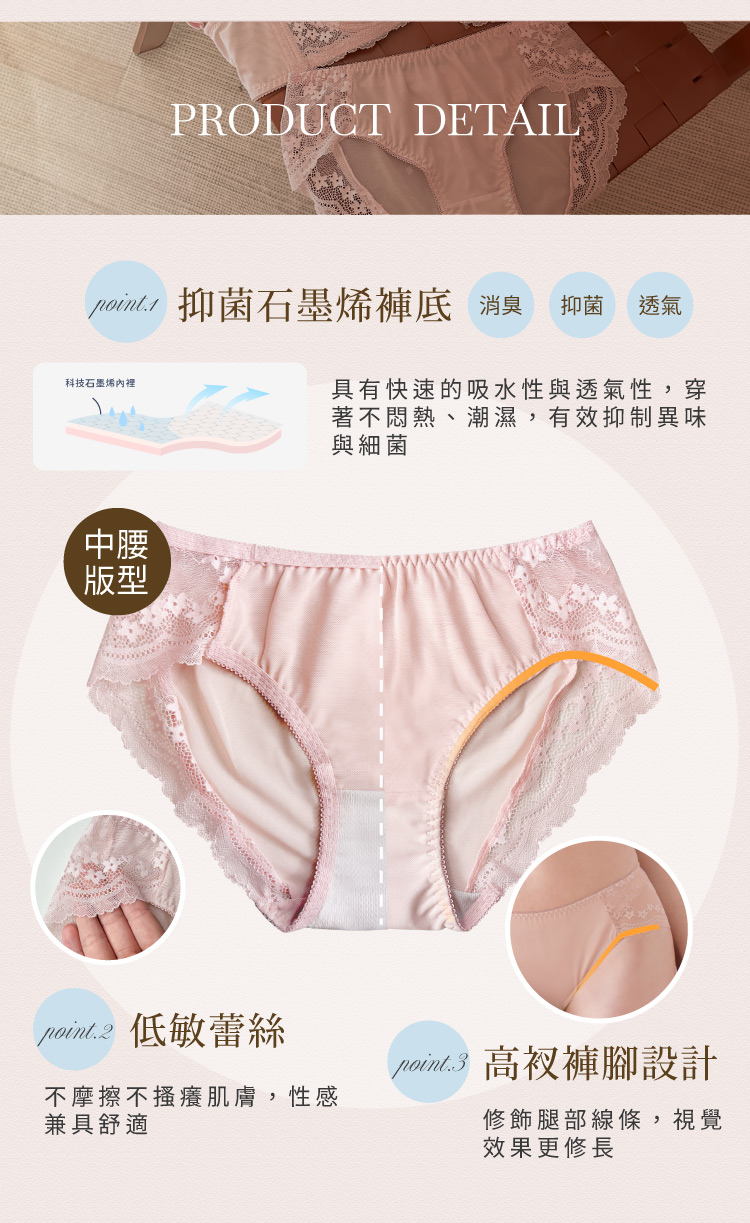 【Clany 可蘭霓】 MIT石墨烯抑菌透氣包臀蕾絲中腰M-XL內褲 3071-36 裸灰粉