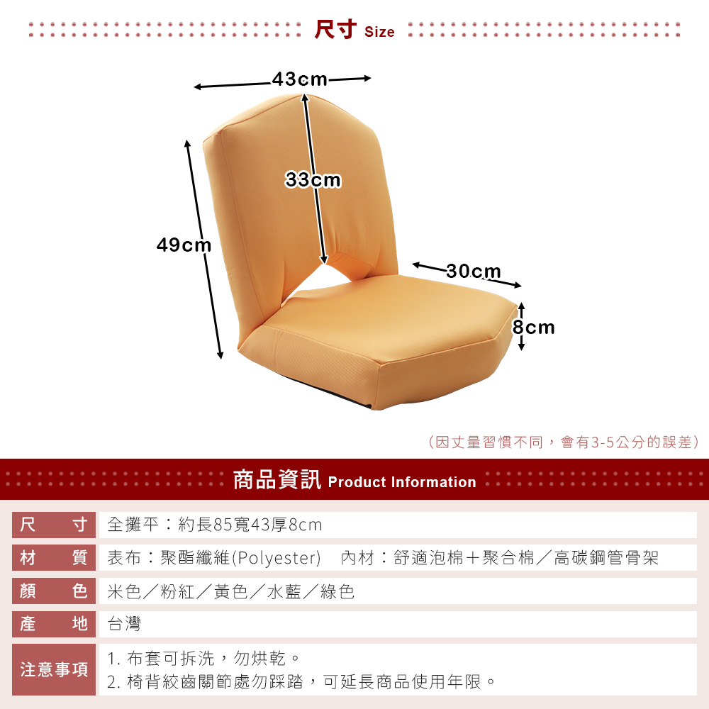 ●台灣製造●輕巧易收納●外銷等級的專利絞齒●椅背可調,攤平收納不佔空間●底部抗刮墊片《 商品資訊 》★尺寸★-攤平-長約85㎝×寬約43㎝×厚約8㎝-和室椅-(椅背) 背寬約43㎝×背高約49㎝(由地量起)(椅坐) 坐深30㎝×坐寬約43㎝(以上規格為人工丈量會有微誤差約±2cm內)★重量★約2.5kg(以上規格為人工丈量會有微誤差約±0.5kg內)★材質★(表布) 聚酯纖維(Polyester)(內材) 舒適泡棉+聚合棉&高碳鋼管骨架★顏色★米色/粉紅/黃色/水藍/綠色★產地★台灣/台南市 ※小叮嚀※1.布套可拆洗,勿烘乾。 2.椅背絞齒關節處勿踩踏,可延長商品使用年限※其他特殊注意事項: