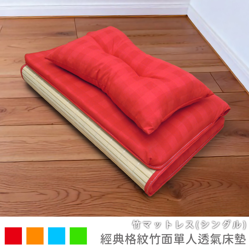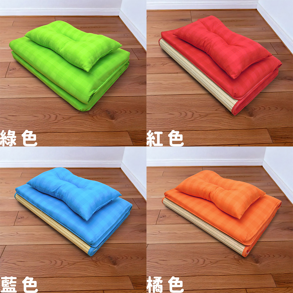 #學生床墊 #單人床墊 #和室墊◆ 尺寸:(攤平) 長180㎝×寬90㎝×厚4.5㎝(三折) 長60㎝×寬90㎝×厚14㎝(枕頭) 長40㎝×寬60㎝×厚15㎝◆ 材質:(表布) 聚酯纖維(Polyester)+天然竹面(內材) 高透氣精絲棉◆ 顏色:紅色/藍色/橘色/綠色◆ 重量:(床墊) 3㎏(枕頭) 0.6㎏◆產地:台灣/台南市◆小叮嚀:1.布套建議不拆洗,若需拆洗僅可【手洗】,清洗前請先將內棉取出再清洗。2.竹面若有沾濕,請務必要曬乾,以免因潮濕而發霉。3.亦可搭配賣場內簡易式床包枕套組使用,拆洗較便利。4.使用前建議先擦拭竹面,天然竹面無上膠,表面會有小細竹削。5.竹面為天然產物表面些微竹斑為正常現象。6.建議定期曝曬床鋪,可延長使用年限。 【備註】— 尺寸/重量為人工丈量,約有±0.5㎝/㎏之差 —— 因拍攝角度及燈光關係,實品顏色更佳,商品圖僅供參考 —1.宅配偏遠地區無配送,商品僅配送至一樓,恕無上樓服務。2.購買前請確認商品詳細規格以保障您自身的權益,鑑賞期僅供鑑賞,非試用期,本商品拆封使用後恕不接受退換貨,退貨商品必須為全新狀態且原包裝完整。