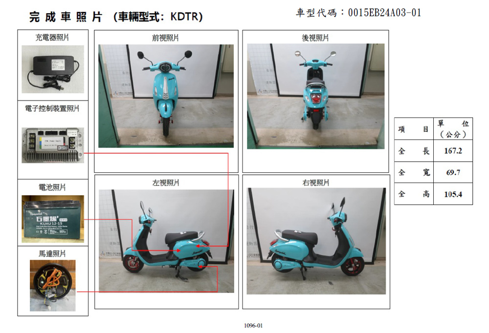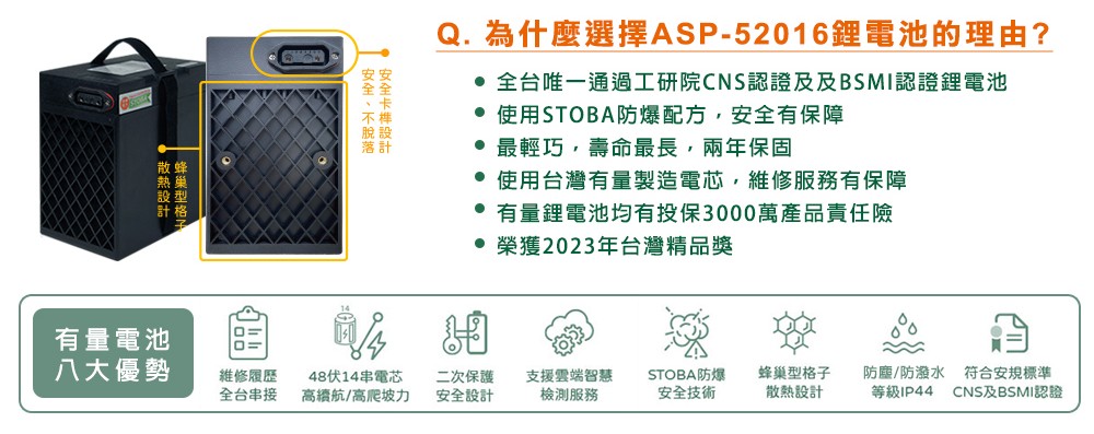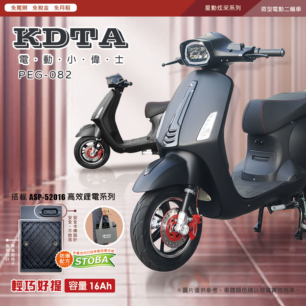 (車架)商品規格:車 型:Mini Hero PEG-082車廠型號:鑛達 小偉士車身尺寸: 168.8*70*109.7cm坐墊高度:69CM輪胎尺寸:3.00-10電池型式:鋰電池/台灣製造(工研院防爆專利配方)電池規格:48V16Ah使用電壓:110v-120v充電時間:3-4小時煞車系統:前後碟剎系統及煞車斷電安全裝置控制系統:正弦波電控無刷輪轂馬達馬達功率:983.49W欠壓保護:有最高時速:不超過25km/h續航里程:約35~40km爬坡能力:約10%安全載重量:100kg定速巡航:有前/後方向燈:前有/後有備 註:續航力會隨著各種因素而變化,例如騎乘重量、坡度、路面情況等等,另外正常情況下電池會逐漸老化,也會影響續航力。(ASP52016/16Ah鋰電池)商品規格電池類型:鋰電池(工研院防爆專利配方)電池容量:16AH電池電壓:48V保固時間:2年保固(限本賣場)電池產地:台灣(有量科技製造)註1. 最高續航力為實驗室測試值,模擬55Kg載重於定速25Km下的最高行駛距離,實際續航力因載重條件、個人騎乘習慣、騎乘路況與天候狀況不同而有所差異。註2. 充電時間是電池從零電量至充飽電的耗時,實際充電時間視當時殘餘電力與充電功率大小而定。產品名稱:電動(輔助)自行車用二次鋰電池組Type(型號):ASP-52016Nominal Voltage(額定電壓):48VDCTypical Capacity(額定容量):16AhMax. Current(最大電流):30ACharging(充電):請使用指定的充電器CNS電池名稱:14CNi-Mn-CoP10/99/131製造年份/號碼:依電池上序號顯示製造者:有量科技股份有限公司地址:桃園市龜山區茶專路6號BSMI證書號碼:CI458061760026號99識別號碼:R45176本商品標準配備:車體 X1保卡及說明書 X1鋰電池x1充電器X1後靠背X1後視鏡X1(組)1年保固期保固內容:以本車所提供之品質保證書內容條款詳述,鋰電池保固兩年(只限本賣場),車架、電機馬達、電子控制器、充電器、保固一年, 各項開關按鈕、轉把、喇叭、DC轉換器保固三個月,外殼塑件、燈泡、車胎、剎車皮屬消耗品無提供保固。 保固適用地區:台灣本島所使用之本公司電動自行車。