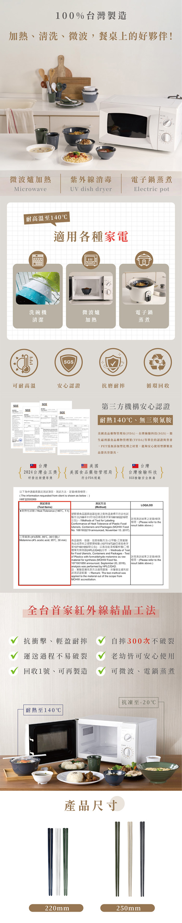 【商品規格】品名:潔晶筷材質:CPET(結晶PET)耐熱溫度:140℃至-20℃尺寸:220mm、240mm產地:台灣有效期限:五年顏色:恬靜白、春茶綠、暮夜藍回收:回收標誌1號,屬於PET材質【產品使用注意事項】1. 本產品僅供食品接觸用途。2. 本產品符合循環經濟,可回收再製粒做工業循環使用。 3. 本產品通過中華民國食品容器規範檢驗。 4. 本產品可用紫外線消毒。 5. 本產品可重複使用。6. 本產品非調理器具,請勿直接置於火源上。7. 請勿加熱空食器。8. 清潔時,請勿使用硬物、鋼刷或粗菜瓜布。9. 勿將CPET潔晶餐具直接置於蒸鍋底部,需放置「蒸架」於電鍋內,方可使用煮、蒸、燉等功能。【貼心提醒】🔸食器可用於微波爐、電鍋、洗碗機、烘碗機、蒸氣/紫外線消毒鍋。🔸商品顏色僅供參考,色樣會因電腦螢幕設定不同而有誤差,顏色以實際商品為主。