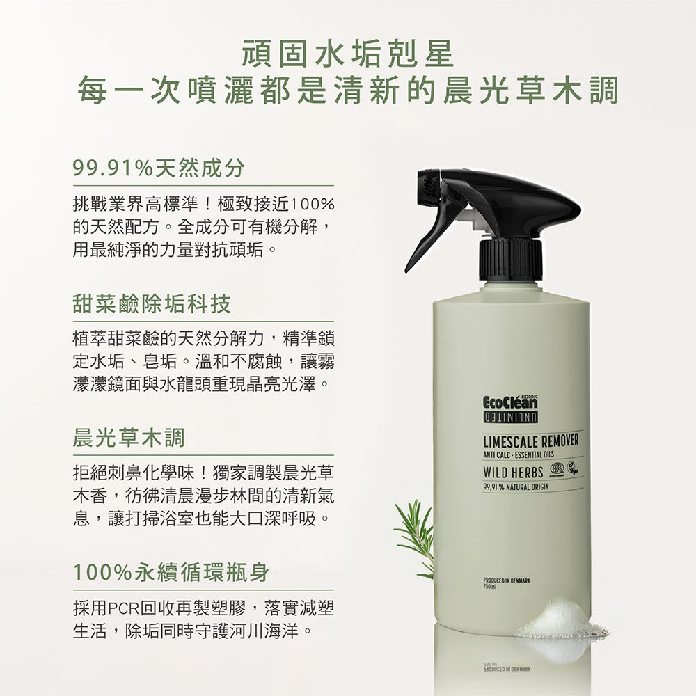 99.91%天然來源成分製成,全成分可有機分解。植物甜菜鹼溫和高效清潔力,有效去除水垢,天然草本香氣,清新不刺鼻。瓶器使用回收再製塑膠瓶(PCR)包裝,100%可生物分解,環保愛地球。