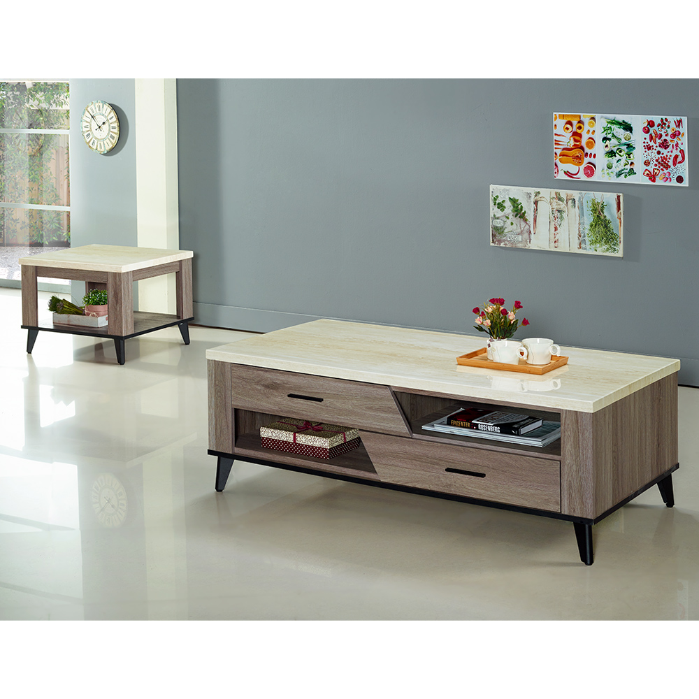 小茶几設計:採用正方形設計,面積小巧,適合小坪數客廳或是多功能空間,抱持動線流暢;仿大理石紋桌面,質感優雅且表面光滑,具備抗汙易清潔的優點;木紋主體、大理石紋與黑色高腳形成和諧的材質與色彩的對比,不僅讓居家擁有設計品味,同時能避免底部藏污納垢,便於清掃。