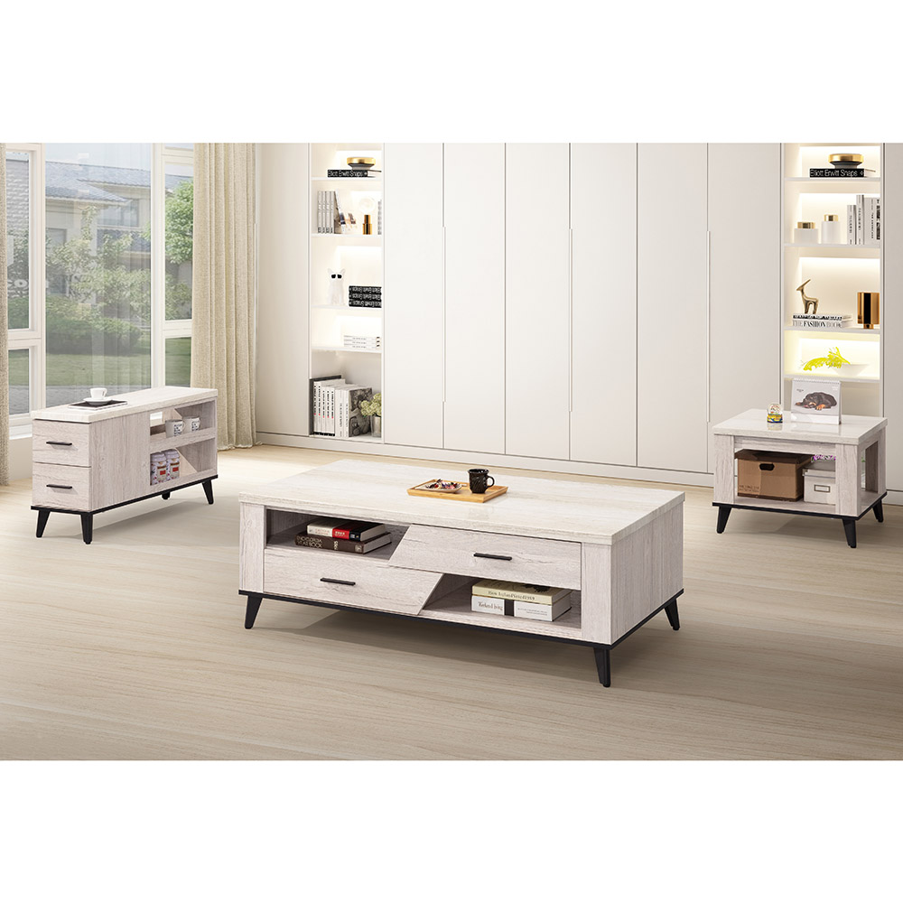 『凱熙橡木白小茶几以清新的仿大理石紋面和實用的方形雙層結構,提供一個清爽、有秩序且充滿品味的角落,輕鬆點亮您的居家空間』