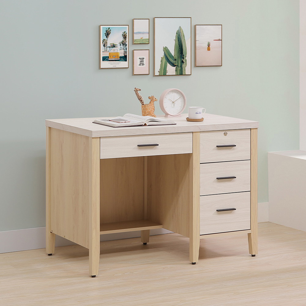 書桌設計:提供兩種色系選擇:溫暖原木色及原木雙色。從視覺柔和的木紋基調,簡潔線條搭配穩固的實木腳設計再到簡約的黑色金屬把手點綴,每個細節都體現之質感與品味。