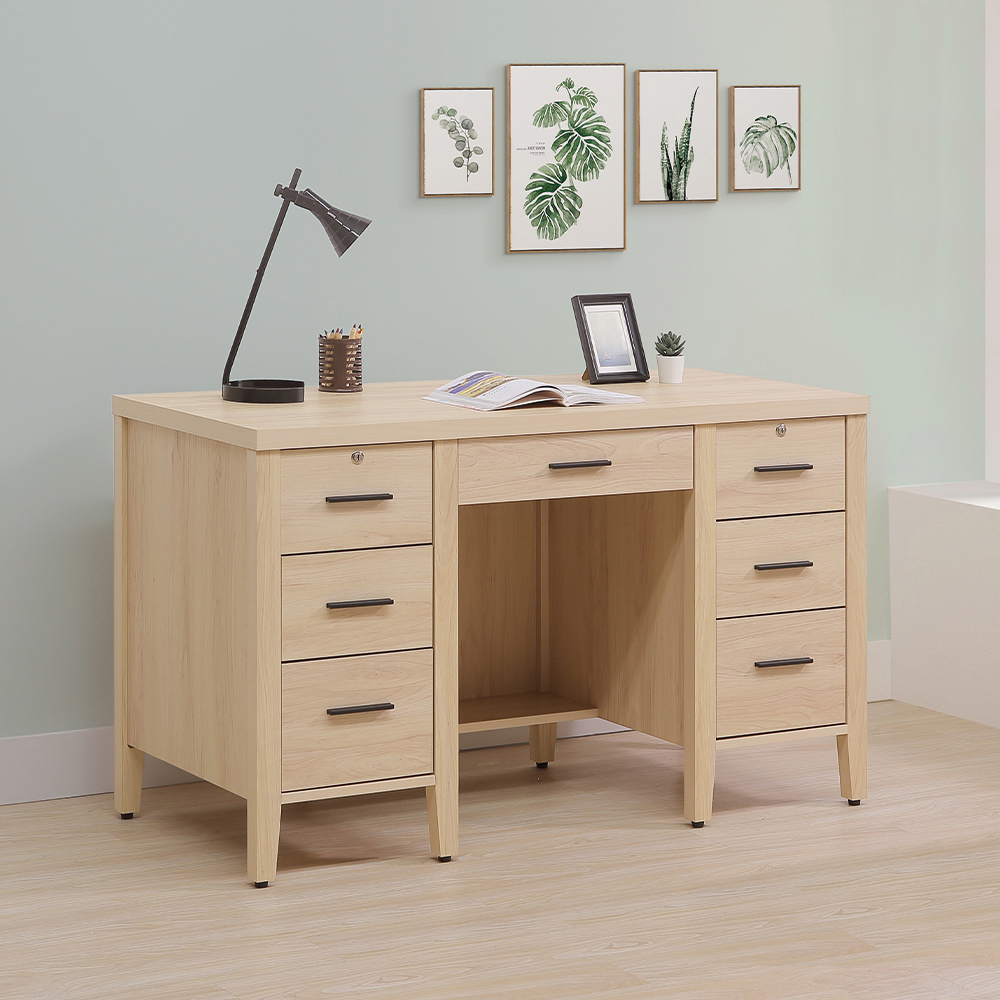 收納空間:桌面寬敞,足夠放置電腦及文具;書桌配有6+1大容量抽屜,第一層抽屜附有安全鎖,可收納重要文件和私人物品;下方開放式設計,提供舒適的腿部空間;底部隔板可用來放置主機或書籍。
